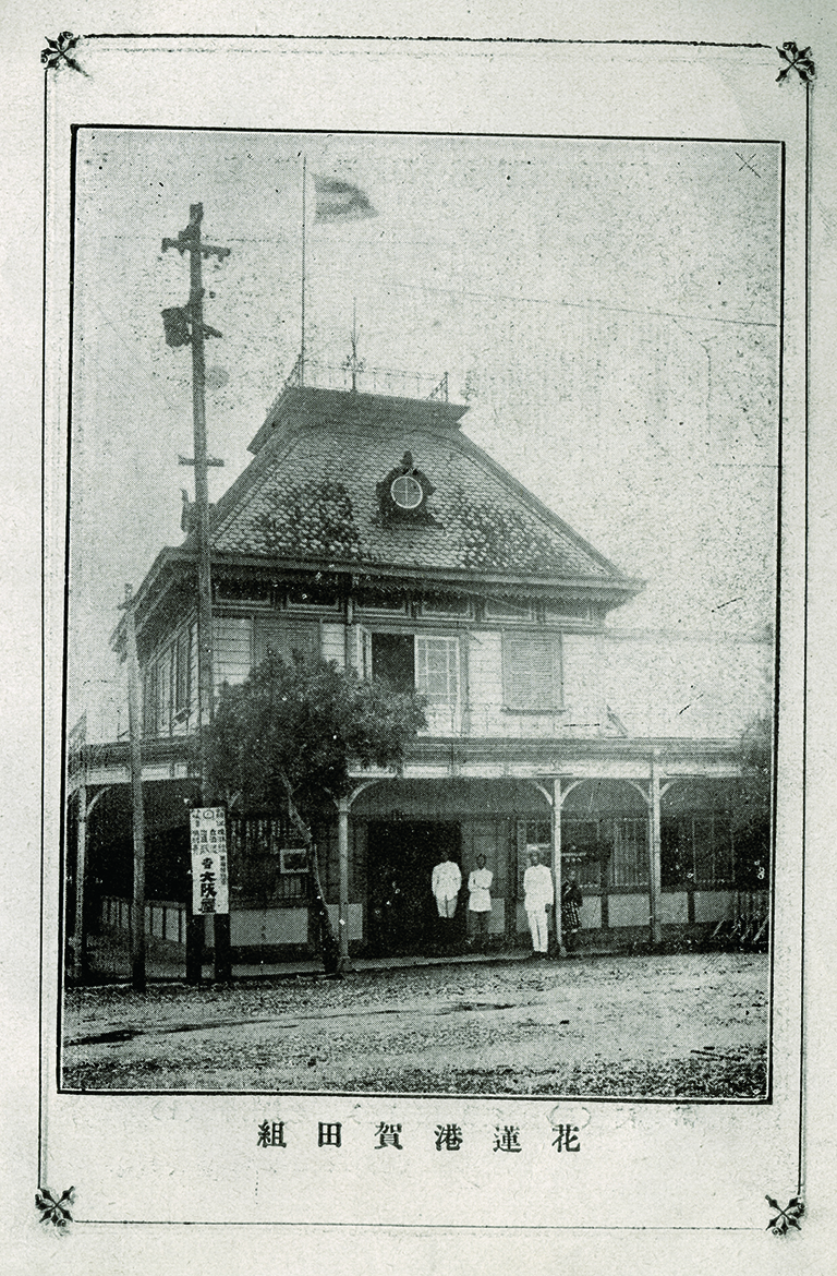 照片中的洋樓,是花蓮近代史中,對於花蓮在地產業有舉足輕重之影響力的賀田組總部。此照片引自橋本白水《東臺灣》,1922年(大正11年)出版,可以看見建築物華麗的鑄鐵裝飾與極具特色的虎眼窗。大約在1899年(明治32年),賀田組在花蓮港建立企業集團,包括航運業、輕軌運輸、採礦、金融、製糖,甚至亦有拓殖開墾、菸草栽培、製樟腦等事業。賀田組總部在當時的花蓮為相當豪華的建築物,在早期的文獻中都可以找到它的身影。賀田組的墾拓地區包含加禮苑(新城鄉嘉里村與佳林村)、吳全城(壽豐鄉志學村一帶)、馬黎馬憩(鳳林鎮萬里橋一帶)、加路蘭(豐濱鄉磯崎村)等地。本資料出自於《顧我洄瀾:花蓮歷史影像集》,此書由花蓮出身的葉柏強先生撰寫,是一本擁有大量歷史影像的書籍,於2016年(民國105年)出版,可以透過此書了解花蓮的城市變遷樣貌。