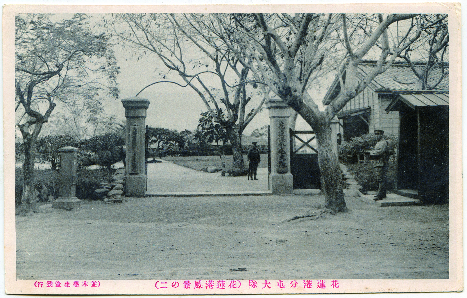 這張圖是大正時代的花蓮港分屯大隊大門,在大正初年花蓮港分屯大隊正門前為上面所說的臺南衛戌病院花蓮港分院,但是後來醫院遷移他處,此地改建為日本陸軍官舍,也就是現在花蓮市非常有名的古蹟:將軍府。花蓮港分屯大隊正式於美崙山東麓山腳下的一塊河階地邊成立,面積廣達五萬坪,當時花蓮港分屯大隊旁邊的橋梁就是筑紫橋,原先的筑紫橋是木材所搭建的,造型就像日本昔日浮世繪中江戶時代的橋樑那般典雅,後來改建成水泥橋,又稱為陸軍橋。本資料出自於《顧我洄瀾:花蓮歷史影像集》,此書由花蓮出身的葉柏強先生撰寫,是一本擁有大量歷史影像的書籍,於2016年(民國105年)出版,可以透過此書了解花蓮的城市變遷樣貌。