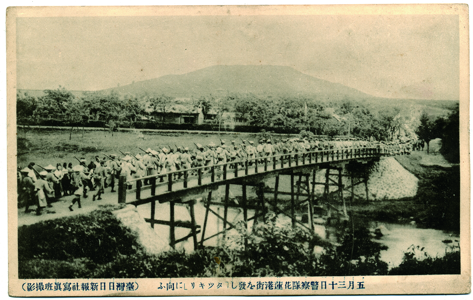 1914年(大正3年)5月30日,正式揭開太魯閣戰役的帷幕,由佐久間總督帶領著近萬人的部隊進攻太魯閣地區,東線的戰事從立霧溪往西切入內太魯閣地區,西線則由第一、第二步兵聯隊自中央山脈往東切,左右夾擊太魯閣族人。圖內的部隊正整齊劃一地向太魯閣的方向前進,隊伍綿延之長,可以看出總督府對這場戰役的態度與重視程度。從照片中可以看出,拍攝者正位於現在花蓮醫院的位置,向當時的筑紫橋與花蓮港分屯大隊的方向拍攝,而背景的小山即是美崙山。此圖為臺灣日日新報寫真班攝影。此影像收錄於《顧我洄瀾:花蓮歷史影像集》一書,為葉柏強先生撰寫、花蓮縣文化局於2016年(民國105年)出版。書中記錄了花蓮近百年的城市樣貌,是一本擁有豐富文史與圖像資料的書籍。