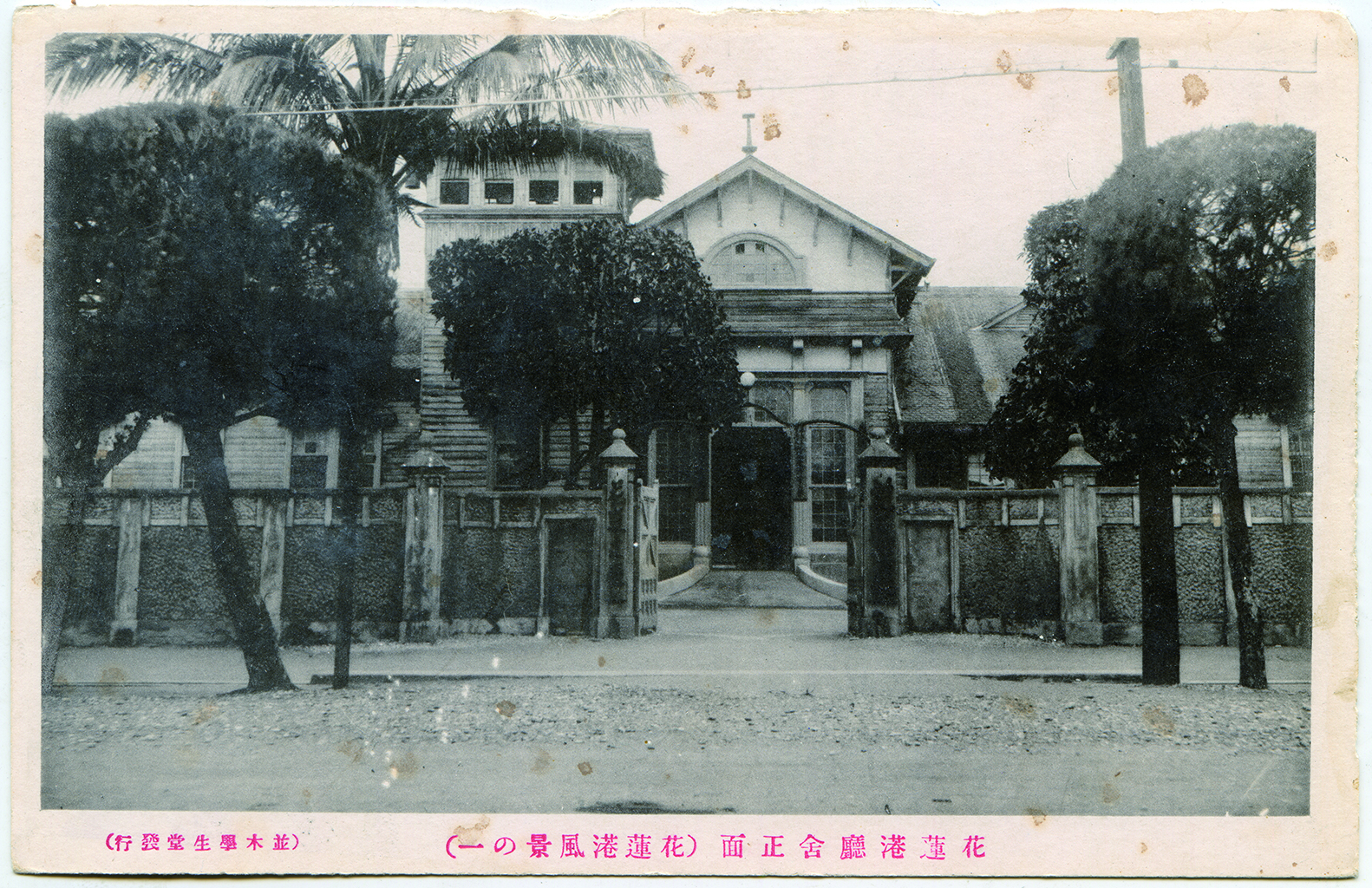 日治時期,花蓮地區原為臺東廳的管轄範圍,直至1909年(明治42年)10月,臺灣總督府敕令282號地方官制異動發佈,將臺東廳轄下的花蓮港支廳與璞石閣支廳,合併設立花蓮港廳,成為花蓮地區當地最高的行政機關。圖中的花蓮港廳舍原為花蓮主要的行政機關,負責管轄當地主要的行政事務與推動持市發展的核心機構。因此公部門在風格設計上,也特別的有巧思,如含有和洋折衷式與典雅風格的造型,同時藉由鵝卵石堆砌的精緻牆面與聳立在門口的兩柱,保留原有的日式風格與情調,故花蓮港廳在當時的建築之中,可說是獨具特色的風景之一。花蓮港廳的設立位置大致位於現今花蓮市中山路與公園路的交叉路口。此影像收錄於《顧我洄瀾:花蓮歷史影像集》一書,為葉柏強先生撰寫、花蓮縣文化局於2016年(民國105年)出版。書中記錄了花蓮近百年的城市樣貌,是一本擁有豐富文史與圖像資料的書籍。