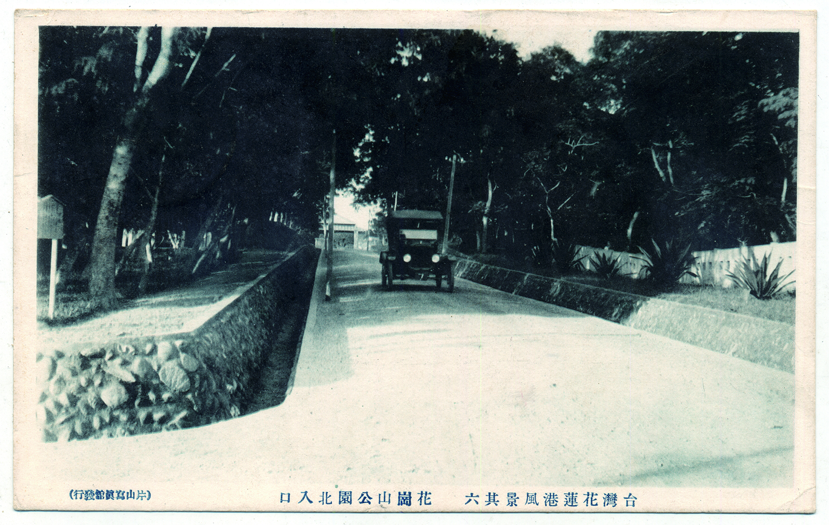 此圖由片山寫真館發行,為日治時期花崗山公園北入口處,可窺見昔日花崗山公園的建設非常完善,如排水系統設施、鵝卵石堆砌的石造矮牆、行道樹的規劃等,同時也能讓車輛方便進出,可見昔日的日本人對當地的休閒遊憩與環境設施建設相當重視。1908年(明治41年)七腳川事件爆發,日本軍攻打七腳川,並剷平花崗山頭約10公尺,約從現今中正體育館前,將山頭剷起,把黃砂質土壤向東邊傾倒,而闢出了現今的運動公園場地。後來日本人將此山丘稱為「花崗山」。如今的花崗山,除了棒球場整建為花蓮田徑場以外,其周圍隨著時間的發展規劃為更完善的公園綠地與休閒遊憩的場所,並同時作為居住地、學校、公共場所等多元發展用地。此影像收錄於《顧我洄瀾:花蓮歷史影像集》一書,為葉柏強先生撰寫、花蓮縣文化局於2016年(民國105年)出版。書中記錄了花蓮近百年的城市樣貌,是一本擁有豐富文史與圖像資料的書籍。