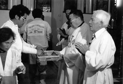 照片呈現王效勤神父在成功天主堂主禮時教友彌撒獻儀場景。1959年2月,王效勤神父由菲律賓回到臺灣,在尚武天主堂協助胡恩博神父(Rev. Otto Hurni, SMB),同年11月9日接替魏鴻榮神父擔任新港堂區副本堂。1959年11月自尚武天主堂調至成功天主堂任副堂職,直至1992年退休,在成功天主堂奉獻前後達33年,是本國籍神父在臺東縣同一任區內任職最久的神父,在其任內曾建立成功培質院以及育德育幼院等。