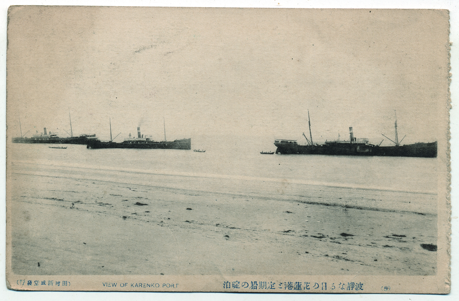 本圖為田村新成堂所發行的繪葉書,主題為風平浪靜的花蓮港,與停泊的定期船之景觀。花蓮港直至1939年(昭和14年)才興建完成,在此之前的輪船運輸需停靠於花蓮南濱外海或是北濱海邊,若兩者都無法停泊,船隻只能駛回蘇澳或基隆港。然而,若是遇上秋季大浪,輪船甚至整月都無法停靠花蓮港。當時停泊外海的輪船需要倚賴小船接駁往來的人員與貨物,而那時的小船名為「駁駁仔船」。駁駁仔船運送的時段非常關鍵,須於中午前完成往返,因為午後的浪濤會隨著風勢變大,屆時不但駁駁仔船無法逆浪前行,有時連輪船都無法短暫停泊。另外,由於運輸不易,貨物易產生耗損,因此當時貨物運往花蓮的費用為全臺第一高。此影像收錄於2016年(民國105年)由花蓮文史工作者葉柏強先生撰寫、花蓮縣文化局出版的《顧我洄瀾:花蓮歷史影像集》,書中收錄了大量花蓮在地的歷史影像,如老照片、繪葉書、宣傳摺頁、郵戳樣式等,是深入花蓮文史的重要書籍。
