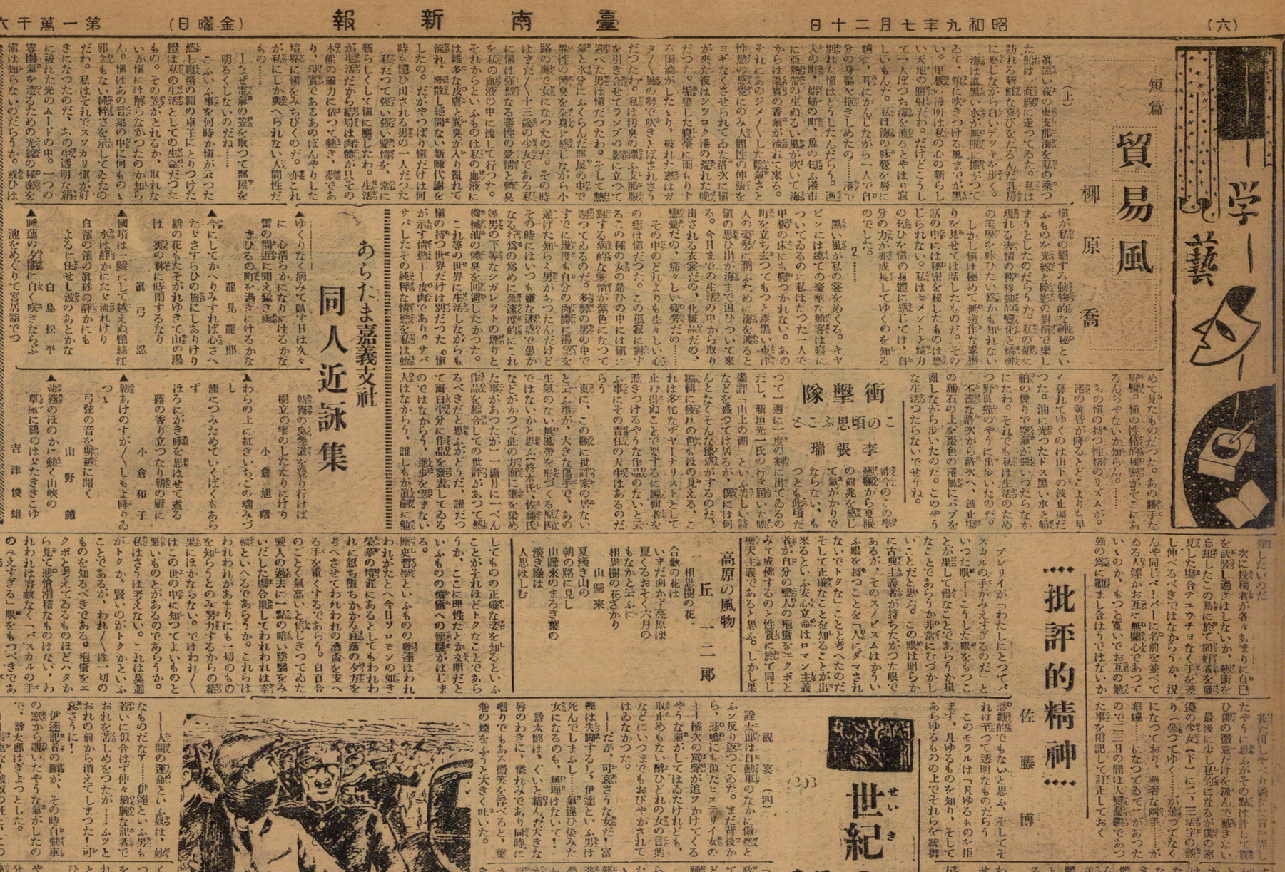 〈貿易風〉為1934年7月20日、28日,楊熾昌以筆名「柳原喬」發表於《台南新報》,原為1932年在日本發行的小說集,可惜皆已佚失。〈貿易風〉描寫搭船離開港町高雄(高雄旗津)以及在東支那海襲擊船隻的經歷,文中以我及第三人稱「慎」的視角交錯的敘事。楊熾昌的筆調打破慣常秩序,追求知性及純粹性,營造情緒的氣氛,並相當程度地與時代處境及風貌景物相連接;從船艙、甲板至海面的移動以及自然景象的險峻,交替著人物內在欲望的呢喃之語,在細膩地鋪陳、描繪海上旅程的險境的同時,也表現了在戰爭底下,對於生活抑或是生存的忐忑與迷茫之情。