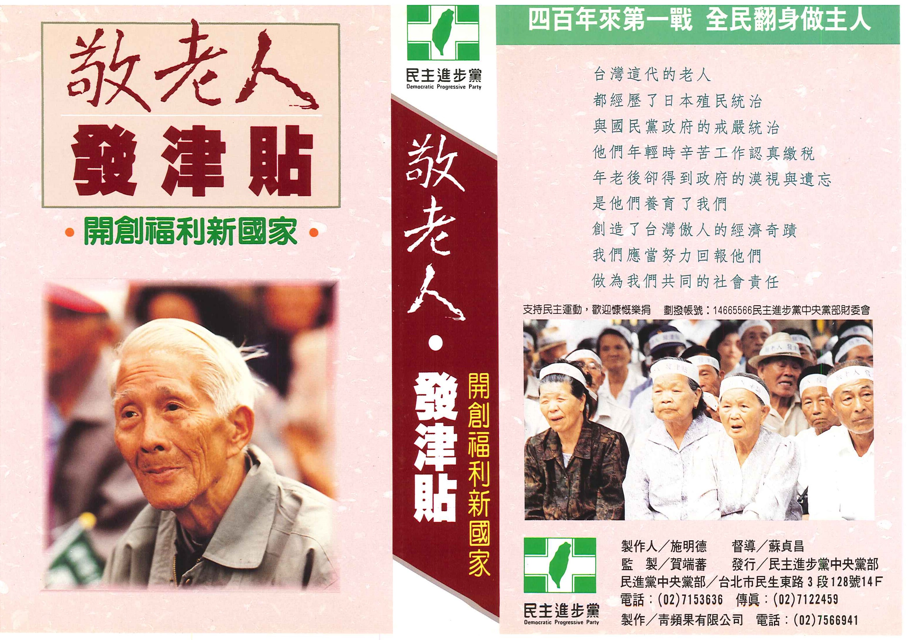 台灣之聲嘉義台所收存的節目錄影帶,敬老津貼播出帶,其封面載明敬老人、發津貼、開創福利新國家,屬於民主進步黨中央黨部發行的敬老津貼政策錄影帶文宣品。