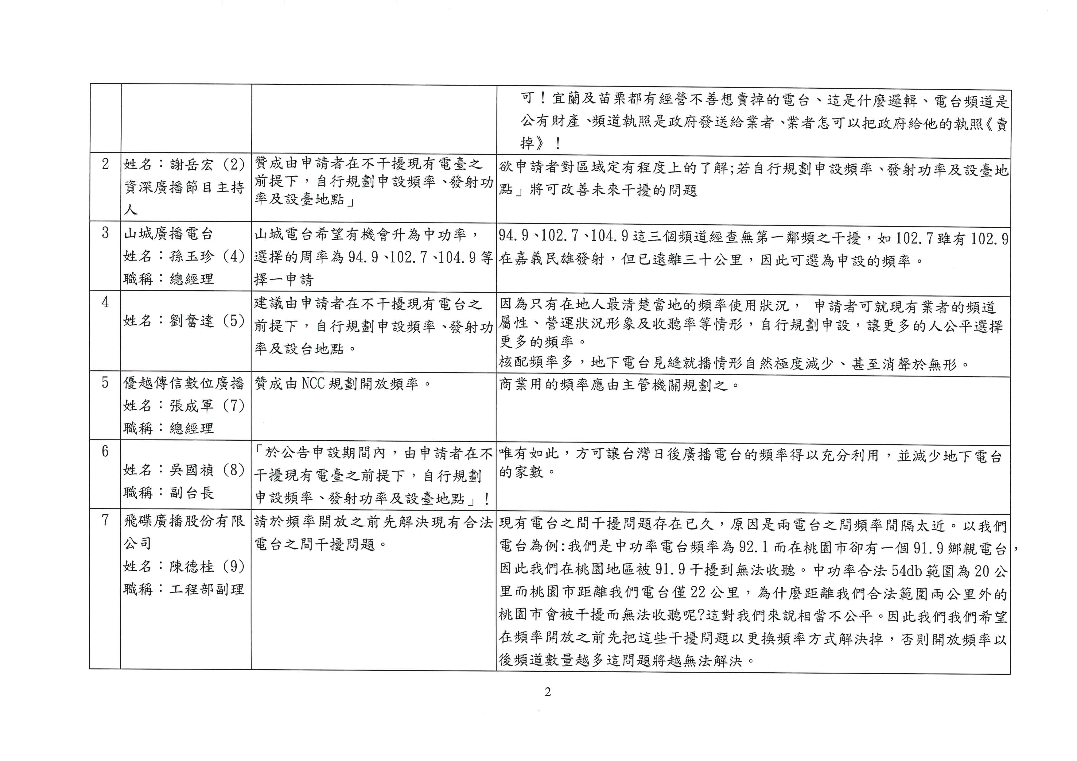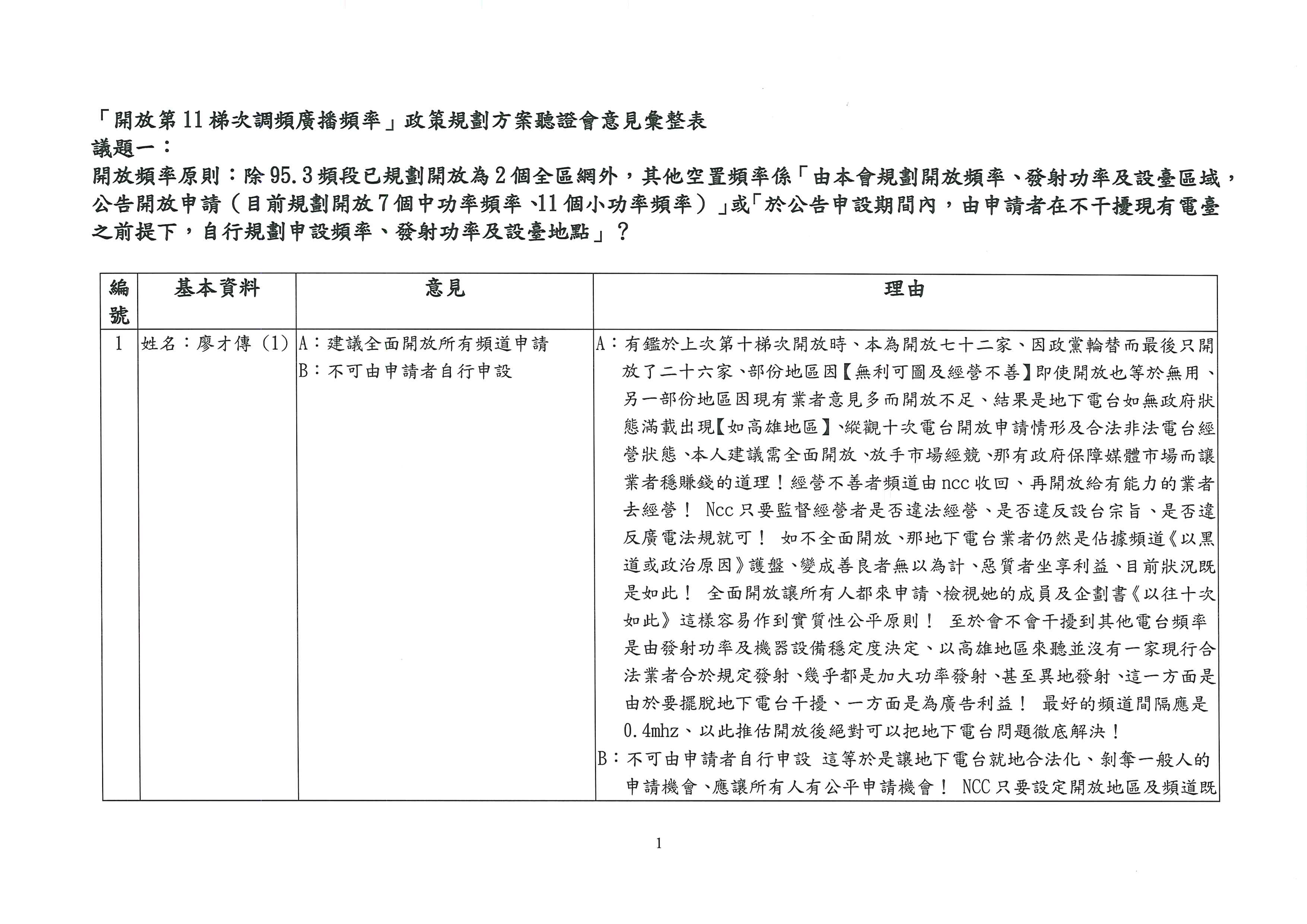 95年11月20日召開之「開放第11梯次調頻廣播頻率政策規劃方案聽證會」書面意見彙整表