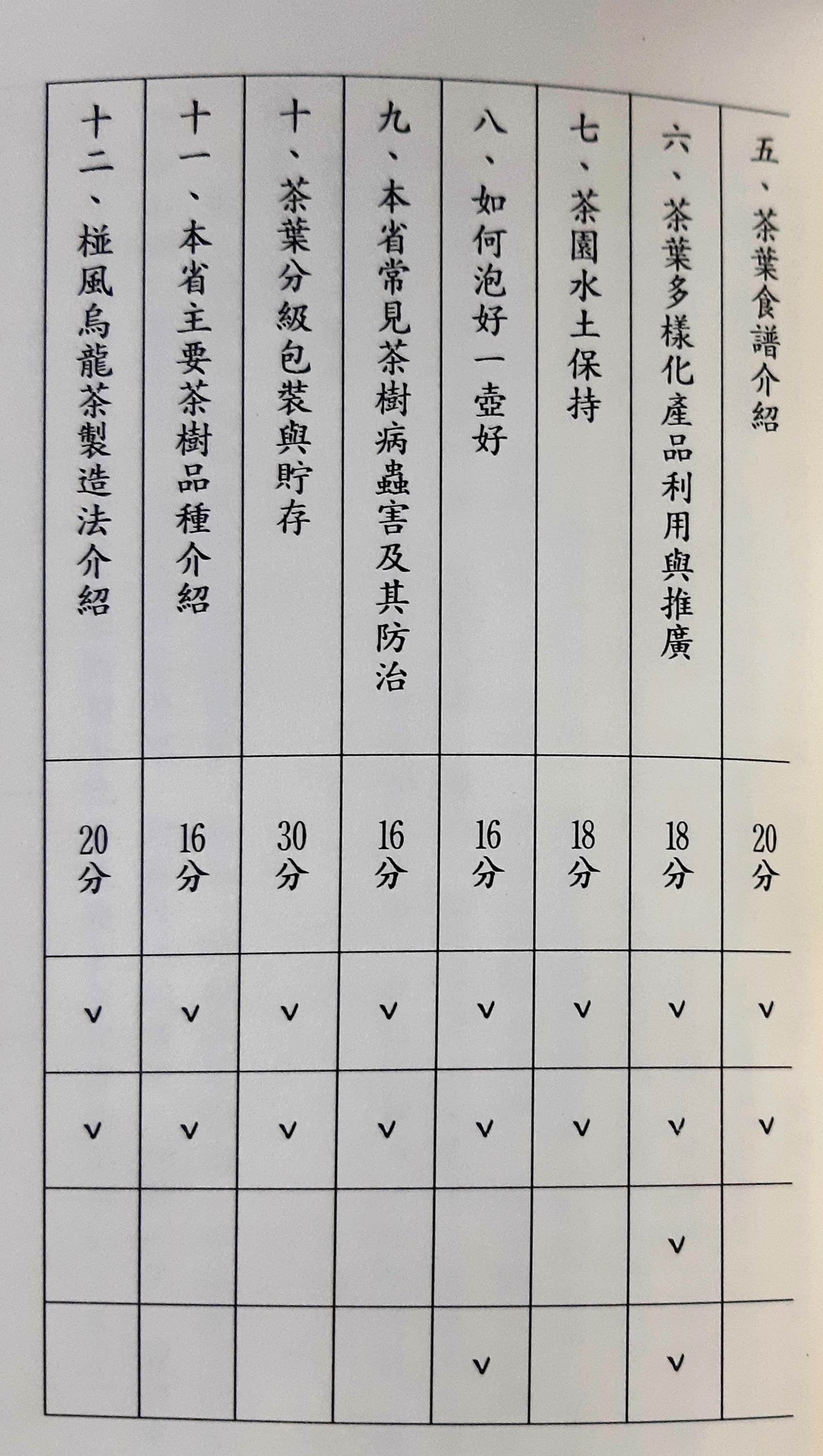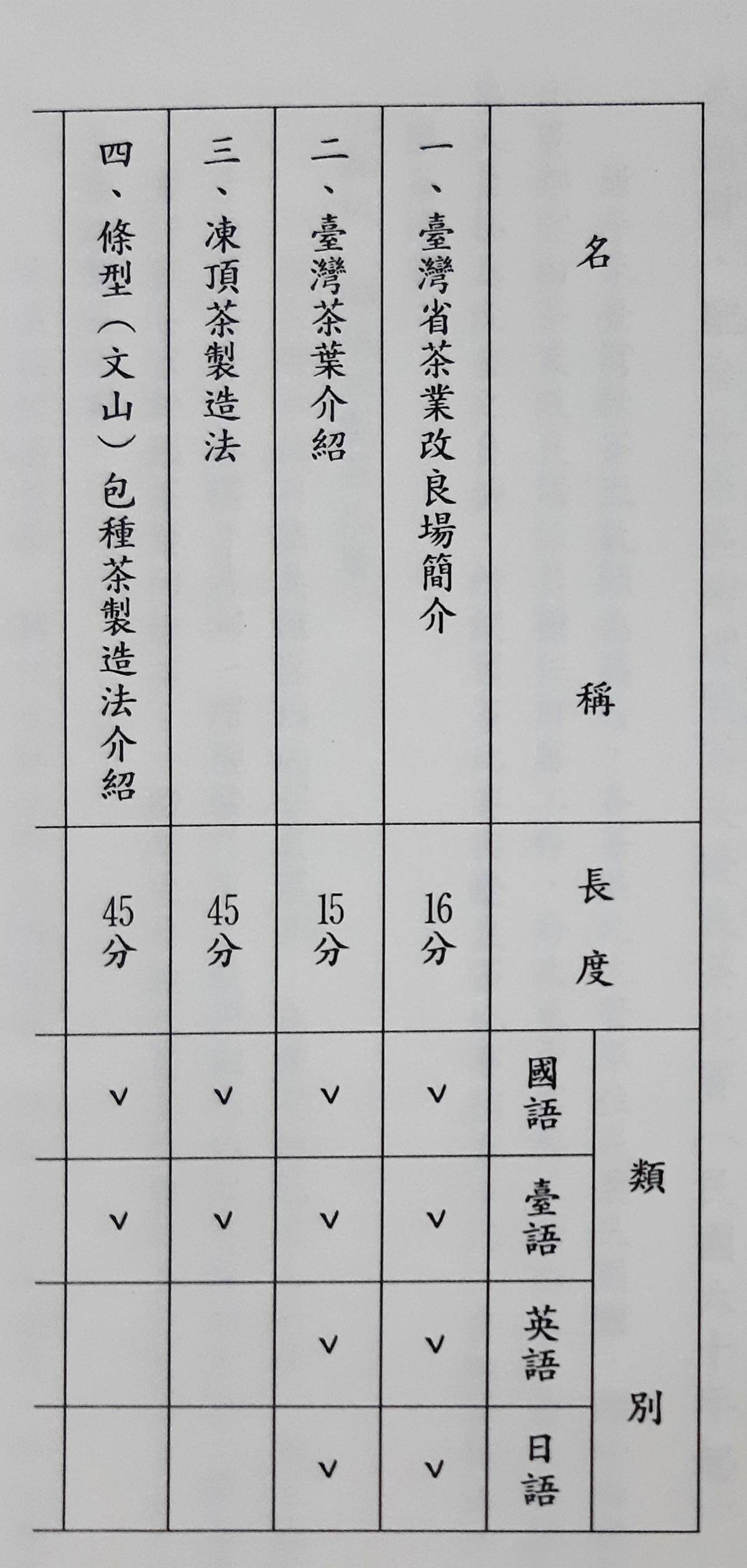 照片拍攝自臺灣省茶業改良場場誌pp346-347,1996(民國八十五)年十二月出版,照片主題為:茶業改良場與中華電視文化公司合作拍攝茶業產銷之錄影帶教材一覽表。