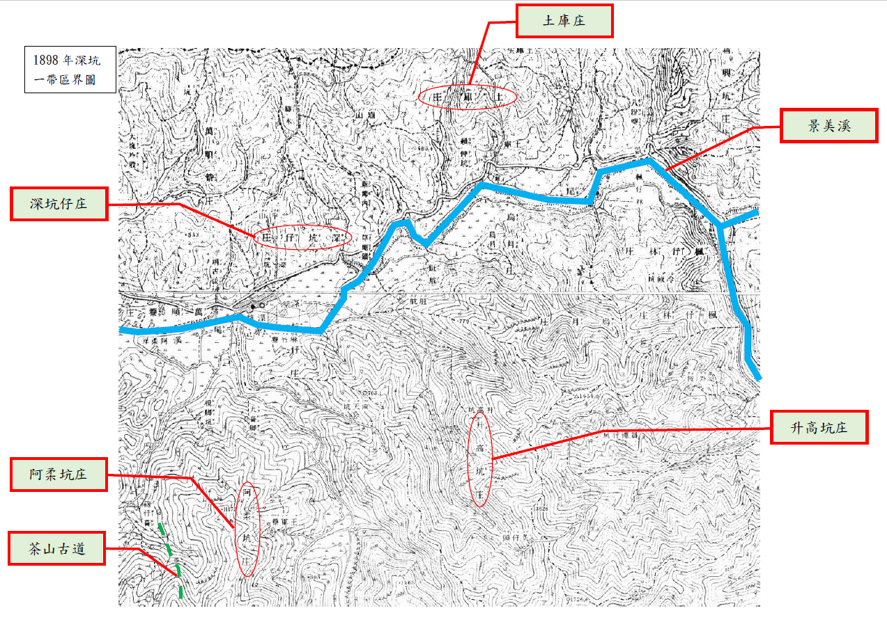 從1898年台灣堡圖的地理資訊系統進行觀察,可以得知的是:台灣茶產業興起後,文山地區的茶葉多匯集在深坑,經由淡水河支流景美溪「水路」運往大稻埕。今日深坑老街就是當時粗治茶中心,也是茶掮客收購茶業的中心,無數茶農、茶商、茶販聚集在此進行交易或轉運,造成老街空前繁榮。
