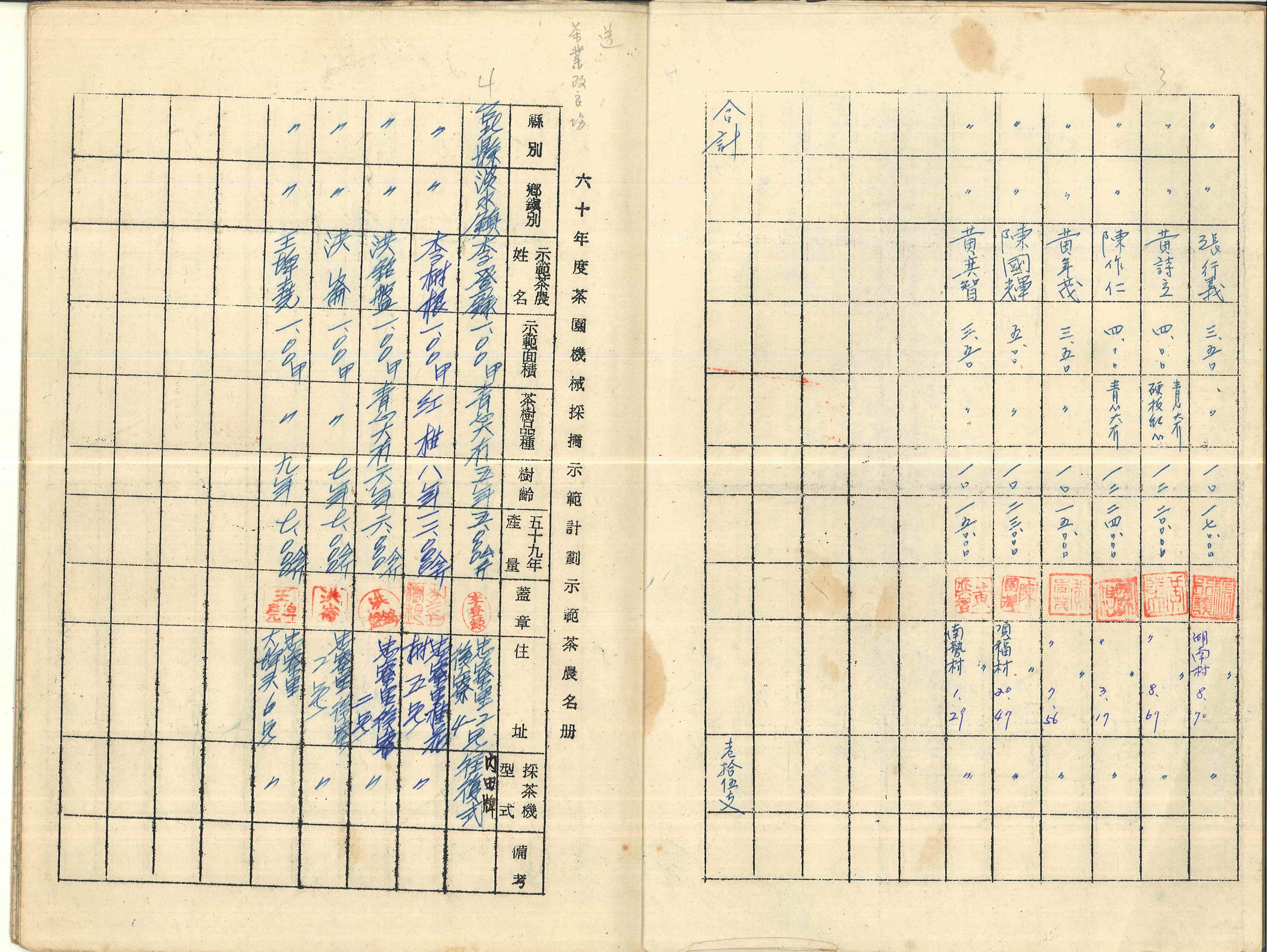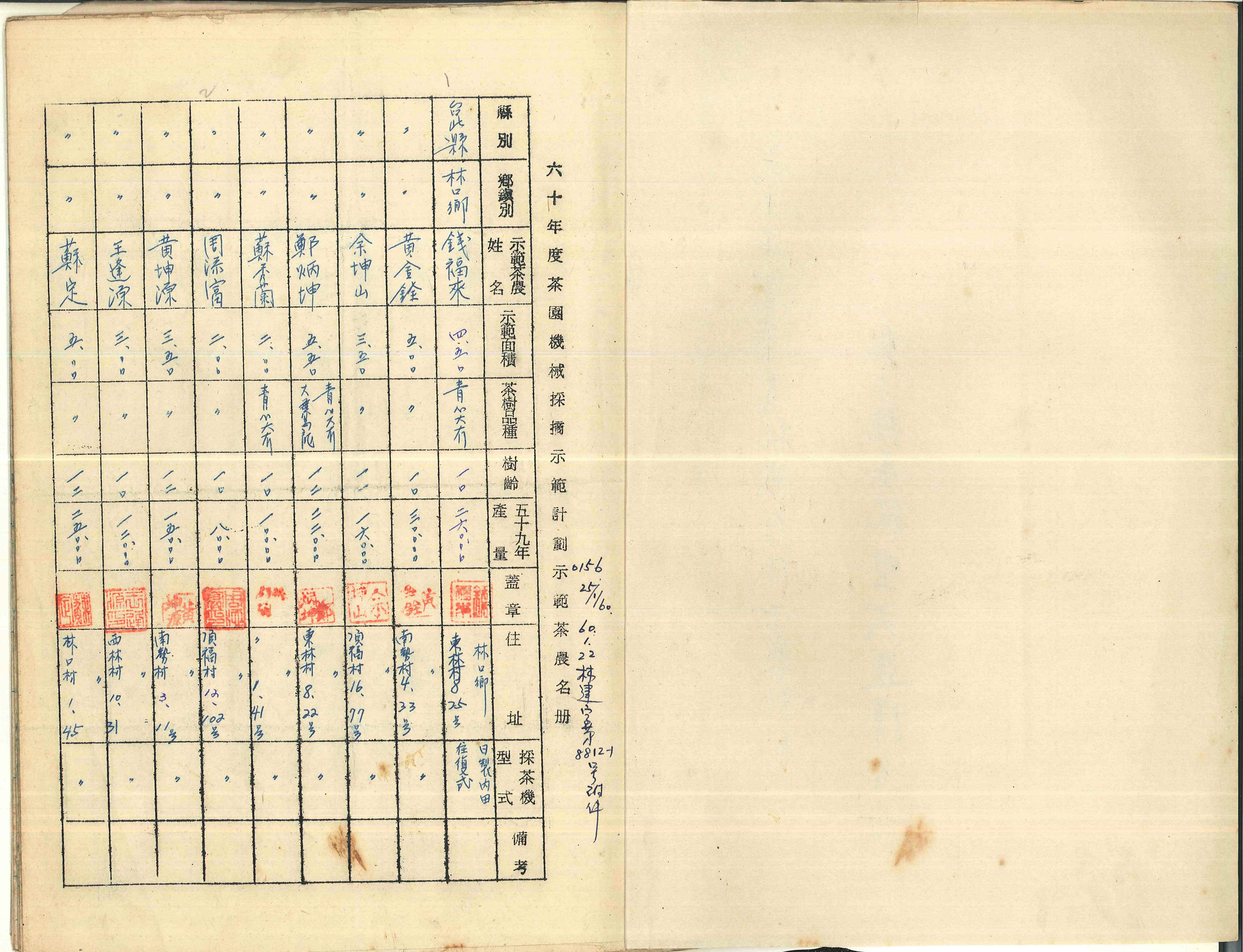 本照片為1971年(民國60年)茶園機械化採茶示範計畫-補助單人式採茶機之機型調查。除調查各農友要購買之單人式採茶機機型,並統一請業者從日本引進,也調查各農友導入機械採收之茶園面積、茶樹品種、樹齡等資料。