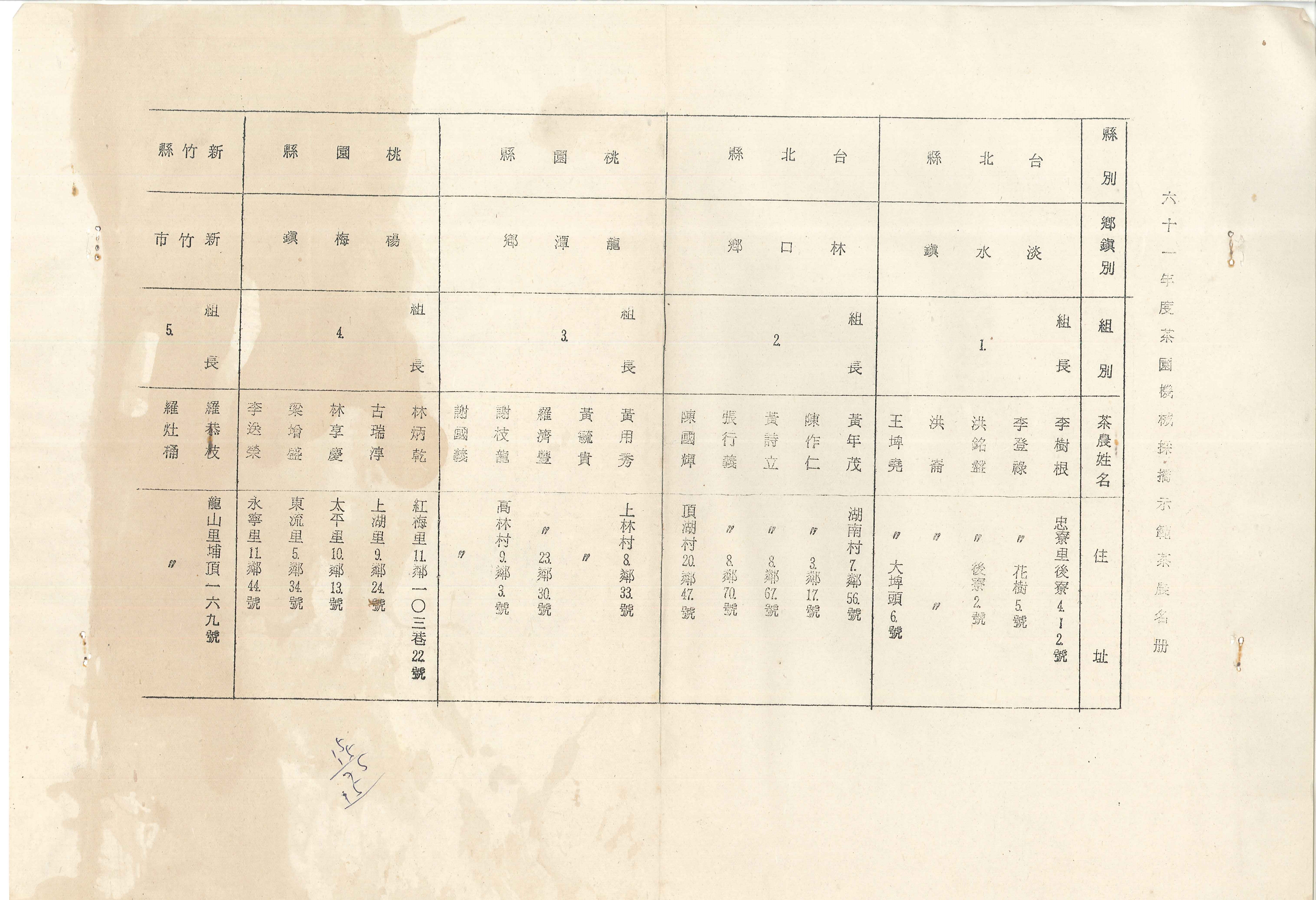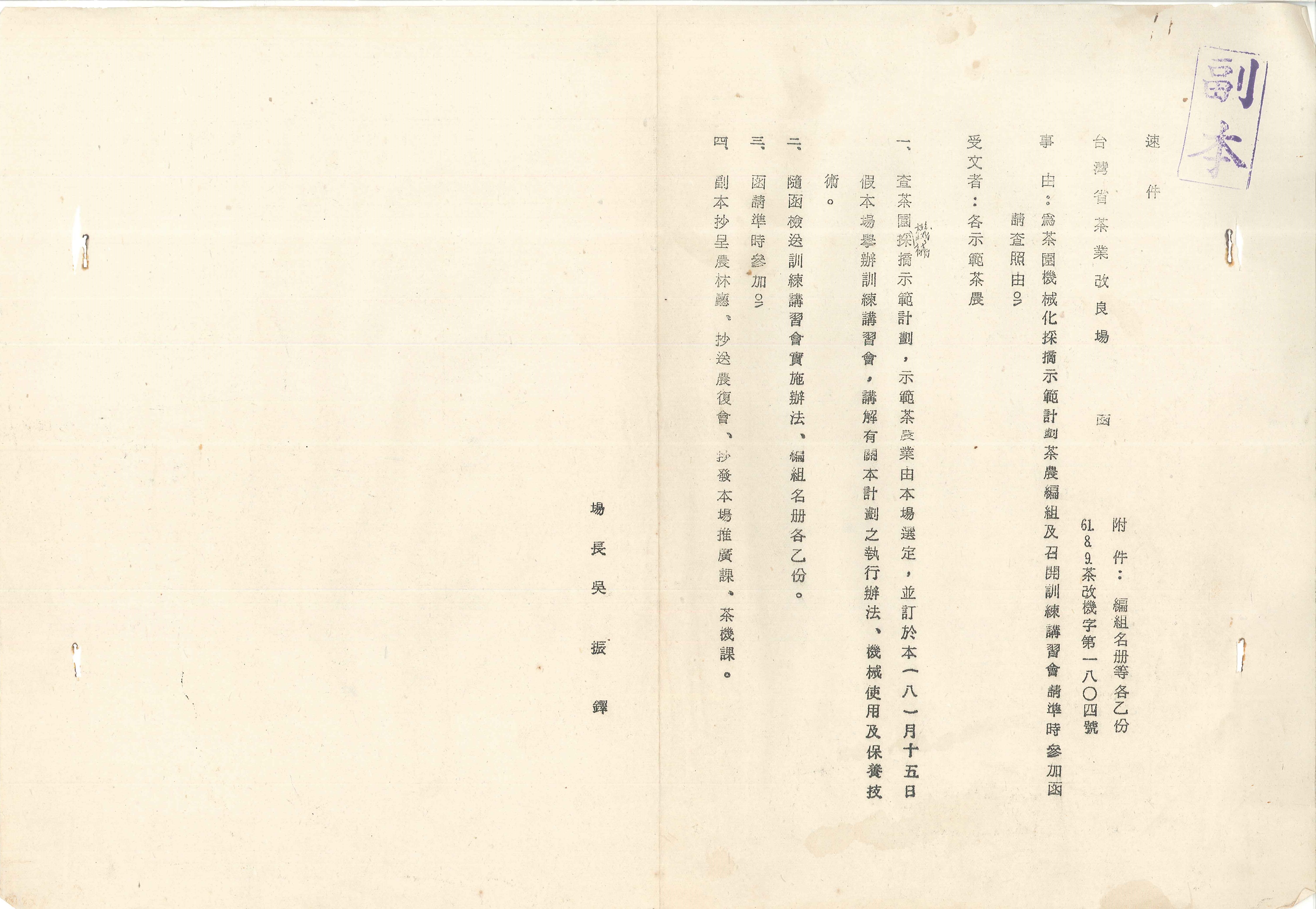 本照片為1972年(民國61年)茶園機械化採茶示範計畫-機採示範茶農編組及召開訓練講習會。從200位工作熱心且配合良好的機採茶農中,選定40位機採茶農,依地域性編制每組5人,總共8組的機械採茶班(如相片),於8/9日舉辦講習會,介紹單人式採茶機使用方法及保養技術。