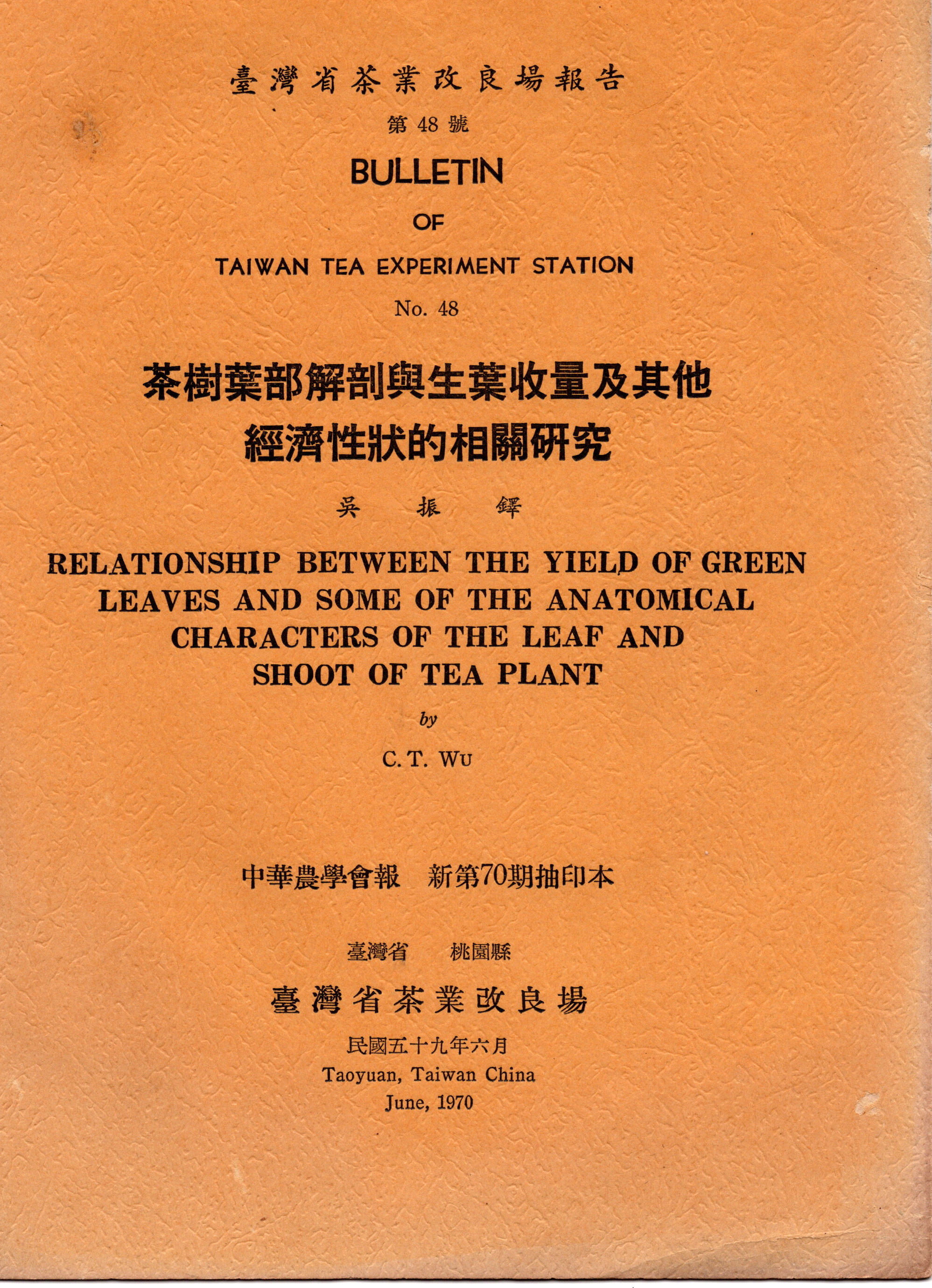 本照片為行政院農業委員會茶業改良場所編印之臺灣省茶業改良場報告第48號-茶樹葉部解剖與生葉收量及其他經濟性狀的相關研究。本書目研究中以21種小葉種及9大葉種茶樹之一心三葉的摘採芽為材料,其目的在於探求解剖茶樹葉部細胞的基本組織,與生葉收量及其與其他經濟性狀之相關。