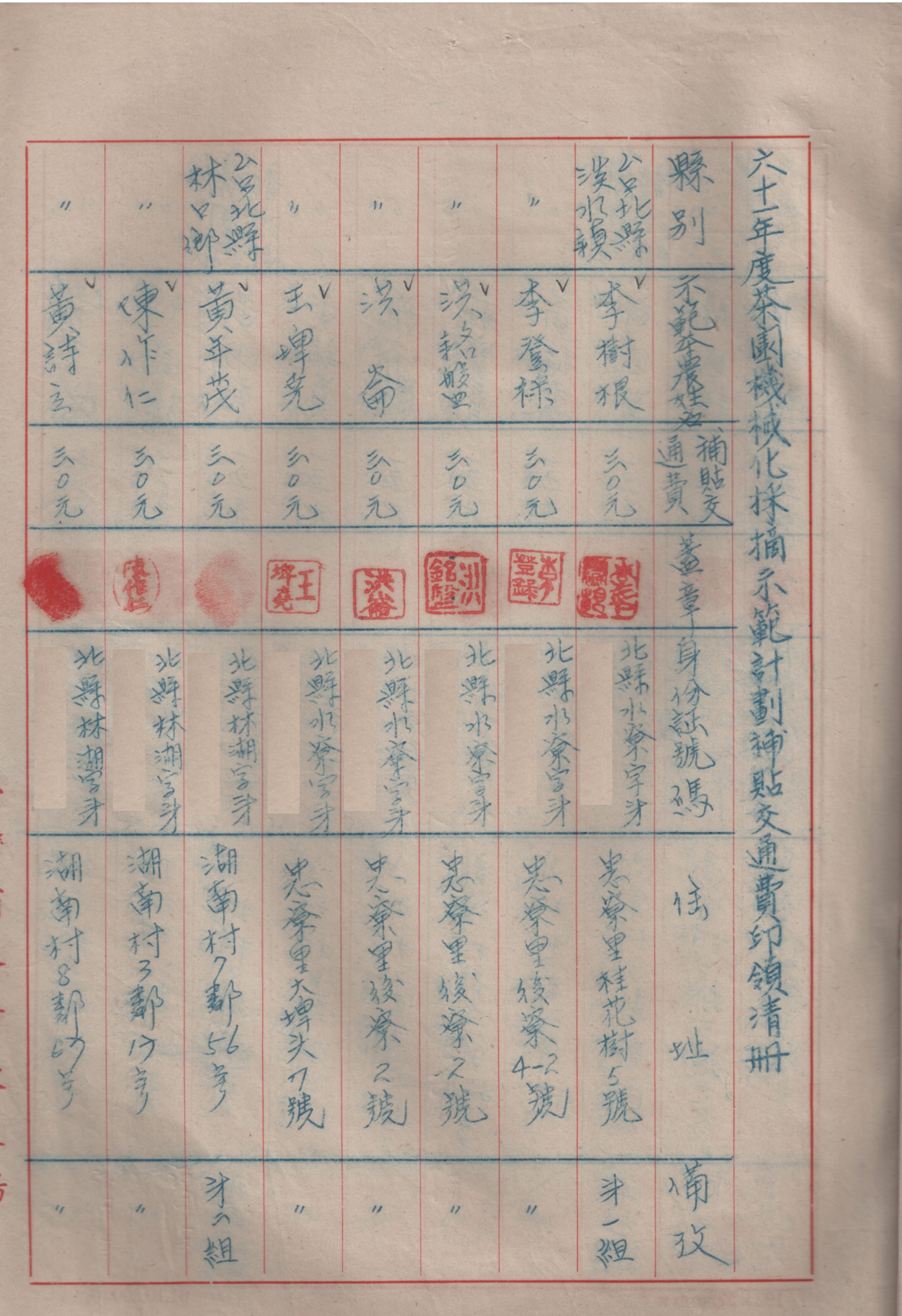 相片為1972年(民國61年)12/27,茶業改良場舉辦機械採茶技術檢討會與觀摩會,當時辦理訓練講習可補貼農友交通與膳食費,依據離茶改場距離不同其津貼額度也不同,參加訓練的茶農必需填寫姓名並蓋章、住址與身份證字號。