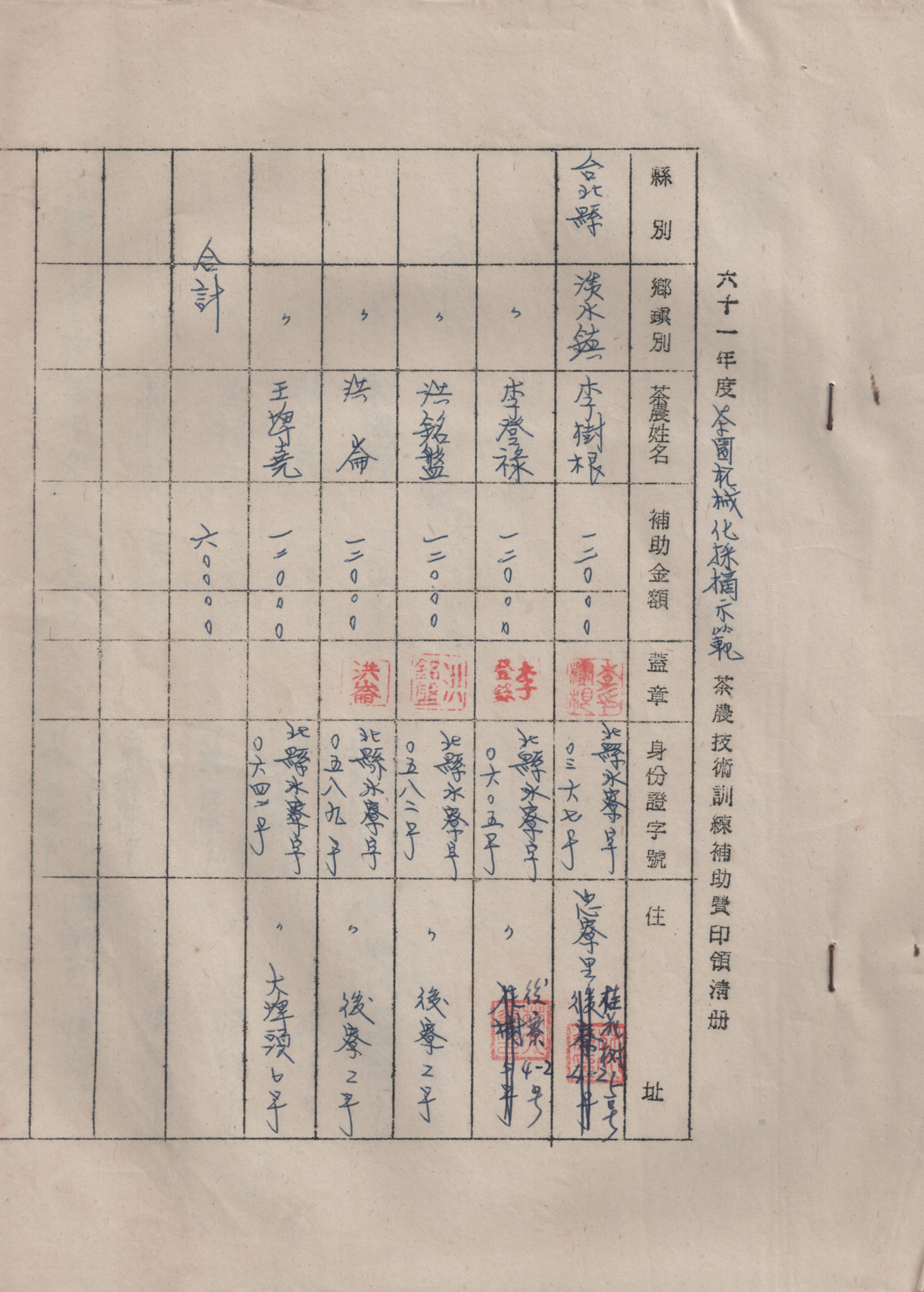 相片為1972年(民國61年),茶農技術訓練簽到單與補助印領清冊,當時辦理訓練講習可補貼農友交通與膳食費,依離茶改場距離不同其津貼額度也不同,參加訓練的茶農需填寫姓名並蓋章、住址與身份證字號。
