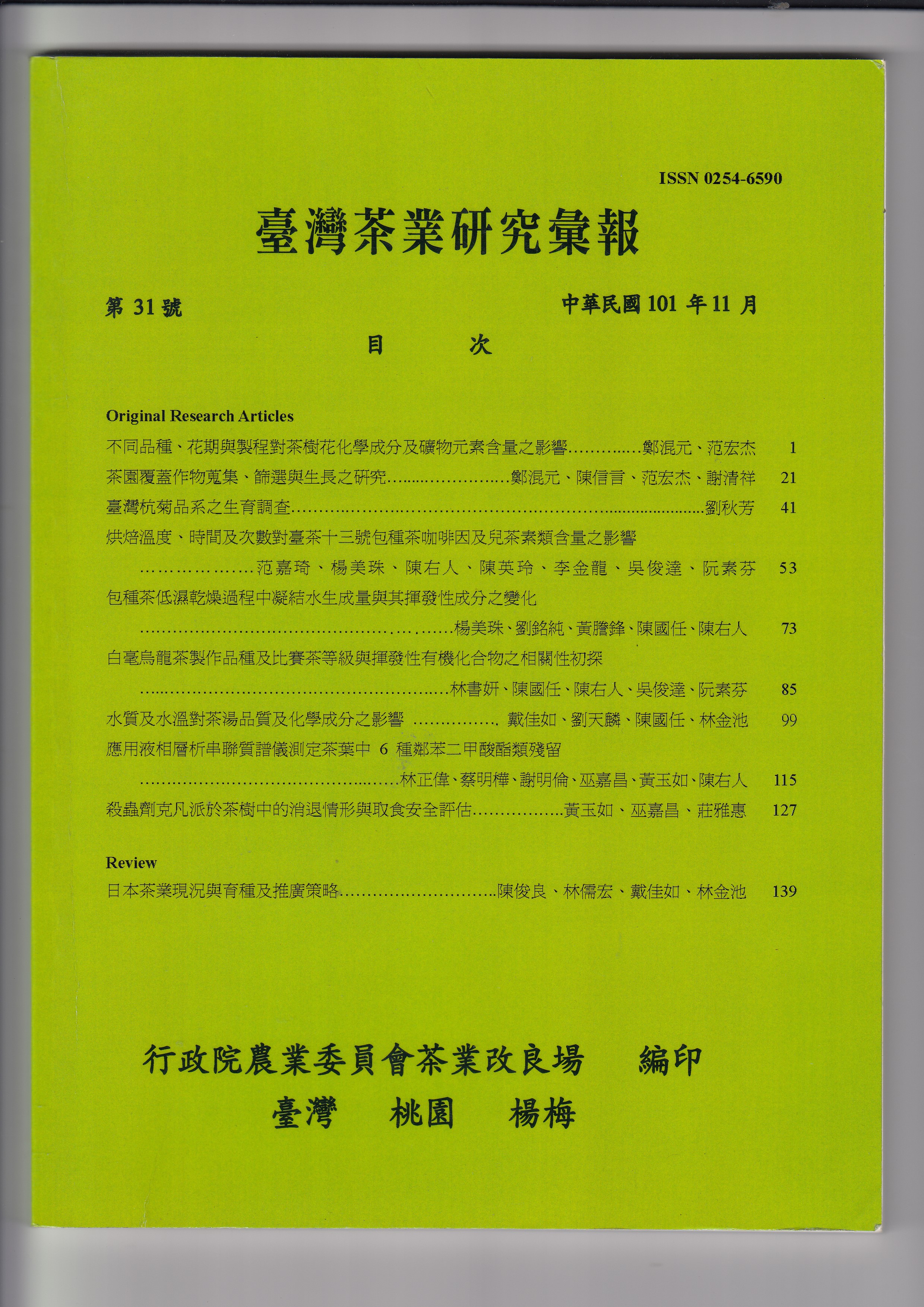 照片主題為臺灣茶業研究彙報2012年(民國101年)第31號封面,探討有關「不同品種、花期與製程對茶樹花化學成分及礦物元素含量之影響」,刊載於本彙報之第1頁至20頁。本篇研究由時任行政院農業委員會茶業改良場臺東分場副研究員兼茶作股長鄭混元、以及副研究員兼製茶股長范宏杰所共同發表。本篇研究目的在於了解茶樹花化學成分及礦物元素含量,以作為日後開發茶樹花新產品之參考依據。