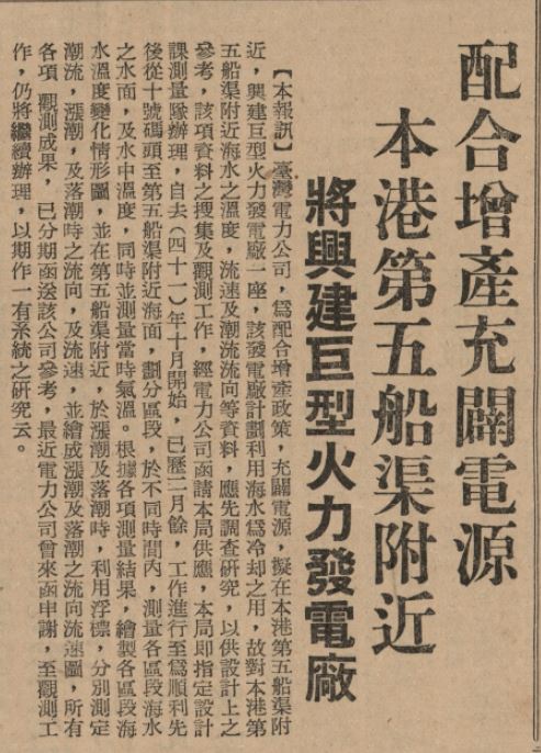 臺灣電力股份有限公司為配合增產政策,充闢電源,擬在高雄港第五船渠附近,興建巨型火力發電廠一座。
