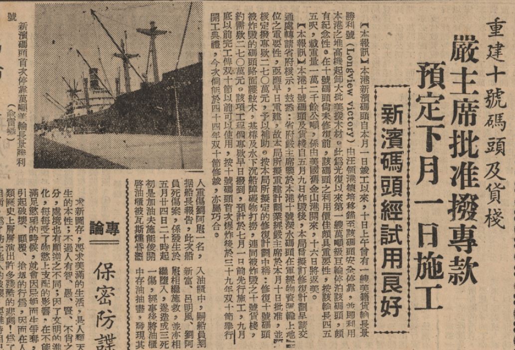 另,高雄港新濱碼頭自1955年6月1日竣工以來,6月10日上午曾有一艘美籍貨輪長景勝利號(Longview victory)由汪領港德培移錨至該碼頭安全停靠,並即利用堆高機起卸大批美援木材。此為戰後以來第一艘萬噸級巨輪停泊該碼頭,頗有紀念性。在十號碼頭尚未修復前,新濱碼頭之利用價值頗具重要性,該貨輪長455呎,載重1萬2千餘公噸,自美國舊金山港駛來,6月16日將返美。