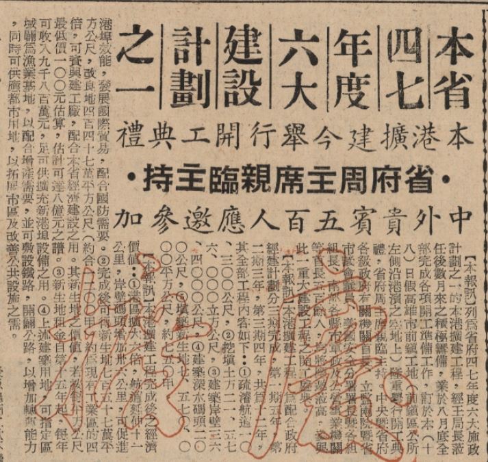 列為中央政府1958年(民國47年)度六大施政計畫之一的高雄港擴建工程,經數月來積極籌備後,訂於9月18日假高雄市前鎮工地(前鎮區公所左側沿港濱之空地)隆重舉行開工典禮,由臺灣省政府主席周至柔親臨主持。