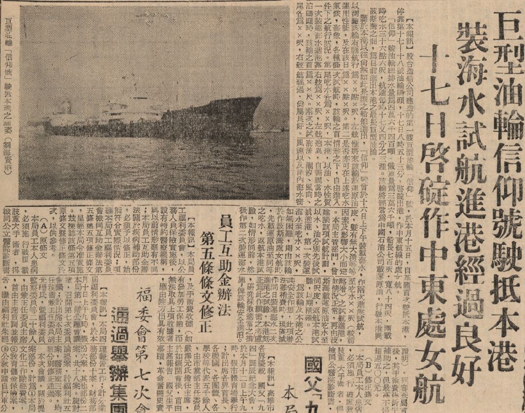 殷臺造船公司建造的第一艘巨型油輪「信仰」號,於1959年(民國48年)11月15日,自基隆首之駛抵高雄港,停靠第十七至十八號油輪碼頭,17日上午8時53分,啟碇出港,作中東航線的處女航。