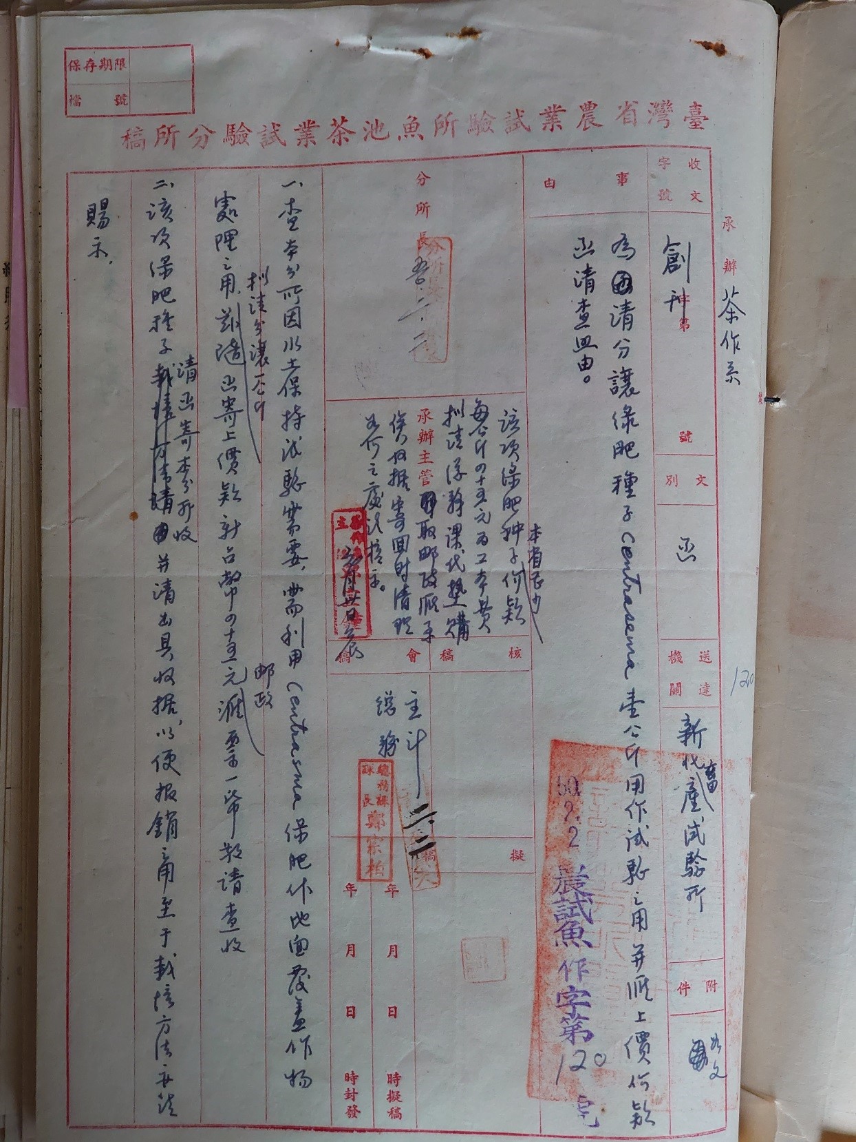 照片為1961年(民國50年) 2月2日魚池茶業試驗分所(即現今行政院農業委員會茶業改良場魚池分場)函請新化畜產試驗所分讓綠肥Centrosema pubescens Benth.(山珠豆) 種子之函稿紙本。