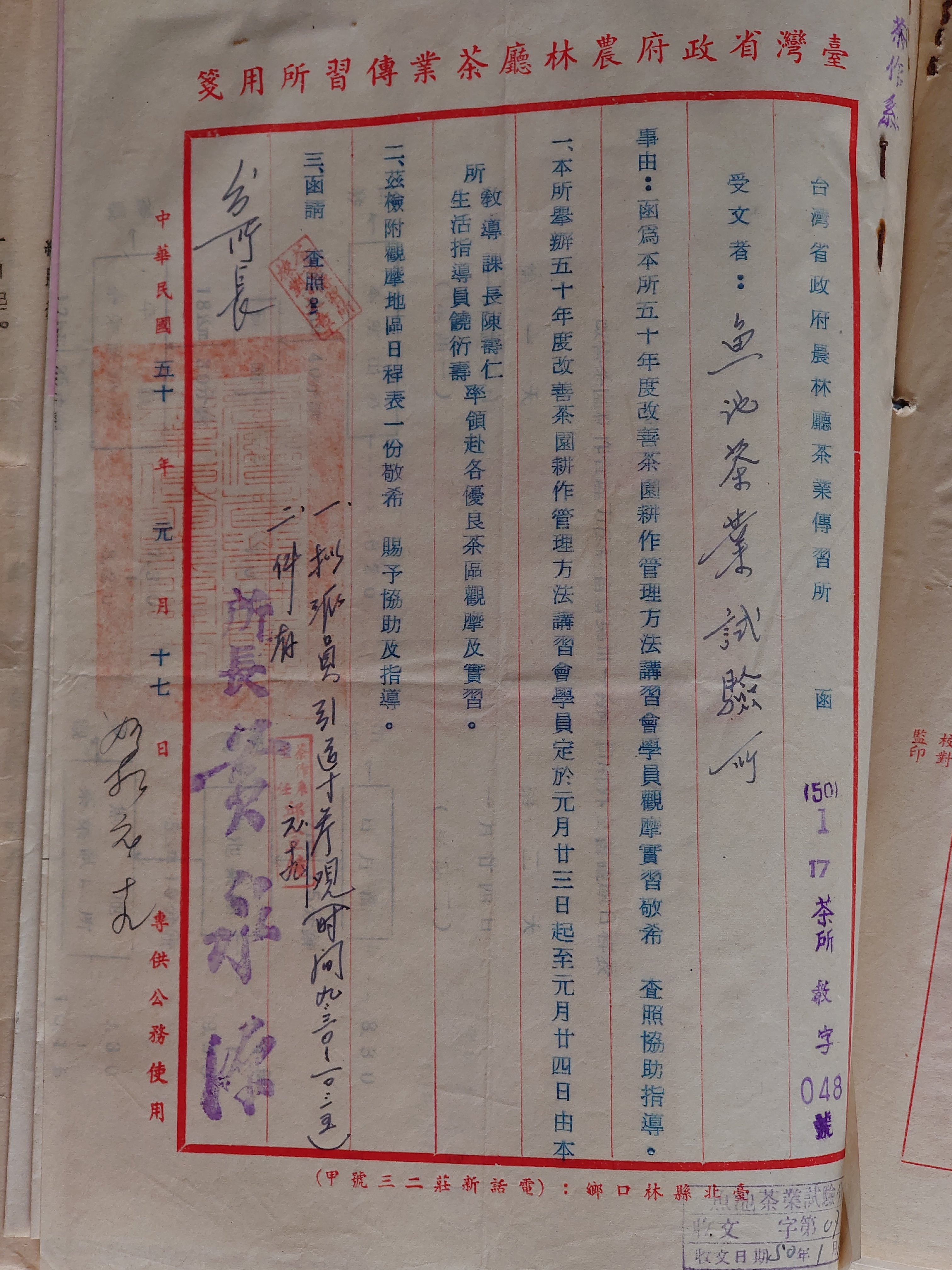 照片為1961年(民國50年)1月17日臺灣省政府農林廳茶業傳習所商請魚池分所(即現今行政院農業委員會茶業改良場魚池分場),協助當年度之改善茶園耕作管理方法講習會學員觀摩實習,行程共計2日,時間定於元用23至24日。