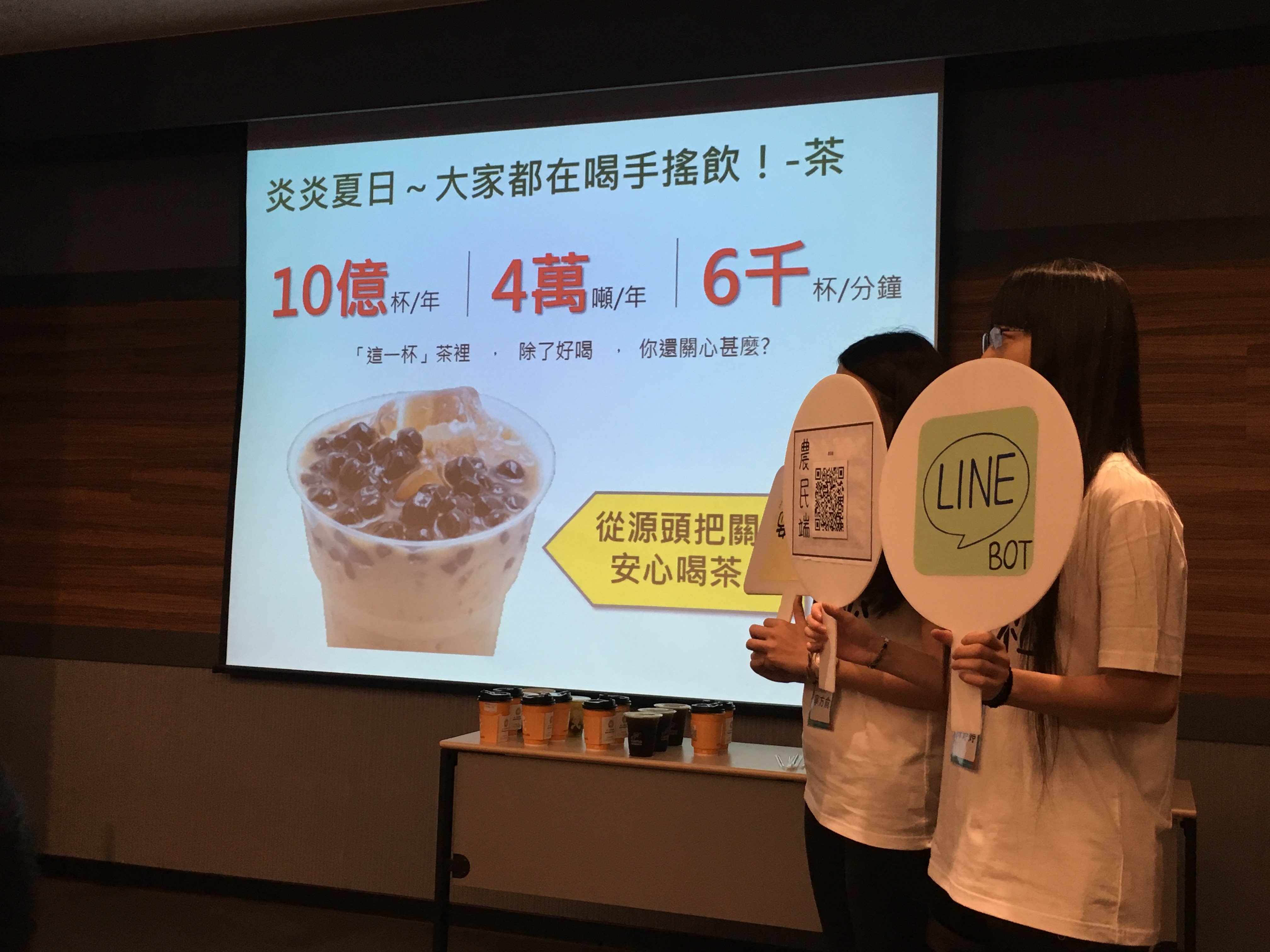 本照片為茶業改良場與其他工作團隊組成「要,不藥的安全」,執行「科技天眼,手搖飲安心喝」,順利進入20強。