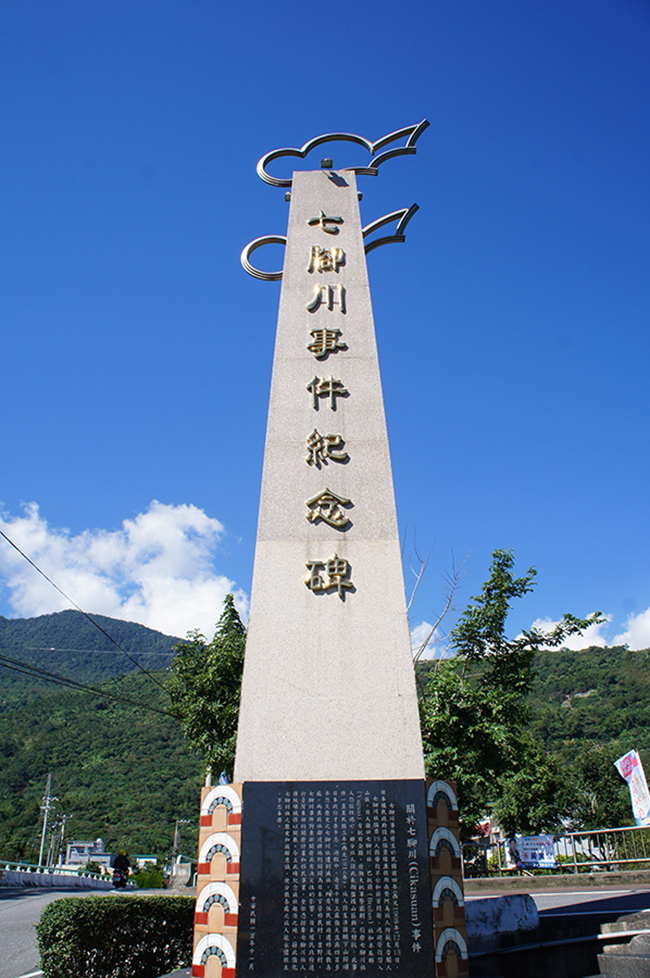 此照片中為七腳川部落中的顯著標的物:七腳川事件紀念碑。Cikasuwan部落,漢語稱做七腳川部落,位於花蓮縣吉安鄉太昌村。七腳川社原本位於現在的吉安鄉福興村,曾是南勢阿美族中最大的聚落,在加禮宛事件後一度是奇萊平原最大勢力,明治41年(1908)以日本政府與阿美族人間因管理隘勇線所發生的薪資糾紛為導火線,爆發七腳川事件,使得族人四散,根據林修澈主編的《臺灣原住民部落事典》中的說法,到昭和5年(1930),原本七腳川社的族人才聚集、遷移來現在七腳川部落的位置。民國97年(2008),在頭目之家(位於太昌村)也舉辦有七腳川事件100週年的相關祭儀及紀念活動。