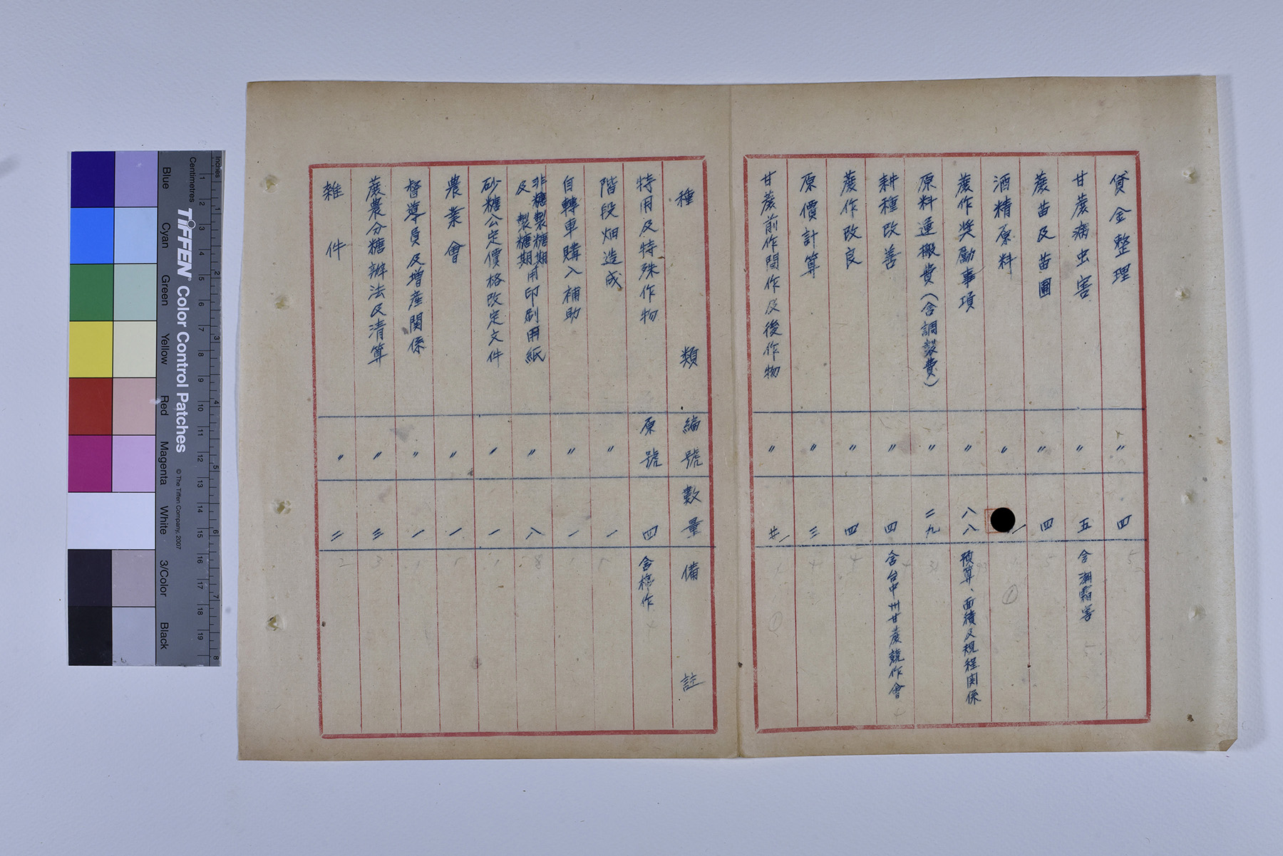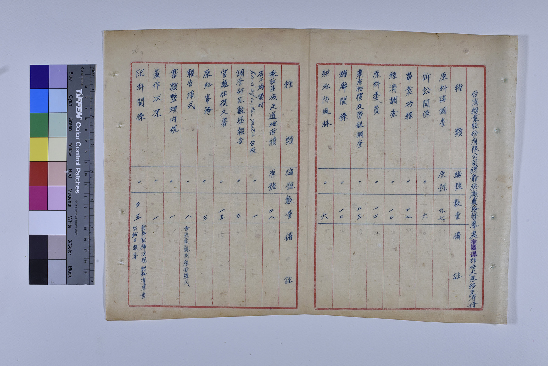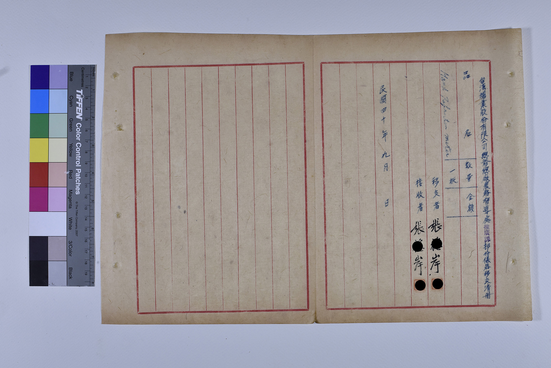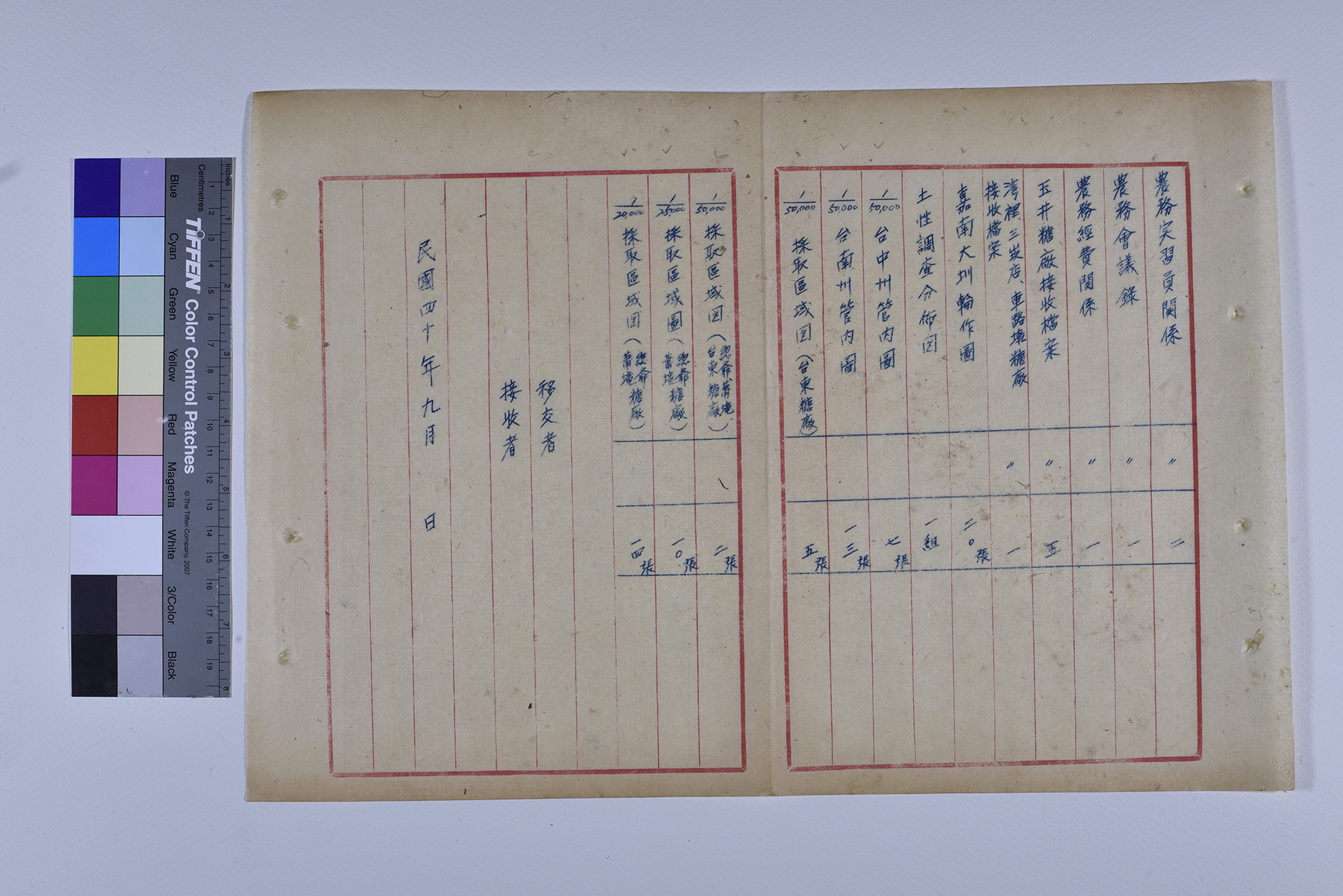 本件為1951年(民國40年)臺糖總爺總廠農務督導處推廣課部分文卷清冊,以十行紙手寫資料4頁,記錄原料諸調查、訴訟關係、原料委員、蔗作狀況、肥料關係、酒精原料、蔗作改良、農業會、農務實習緣關係、嘉南大圳輪作圖、臺中州管內圖、臺南州管內圖、採取區域圖等文卷項目的規格、數量、保管人;並有移交人與接收人張穩岸之簽名與鈐印,日期「民國四十年九月日」
