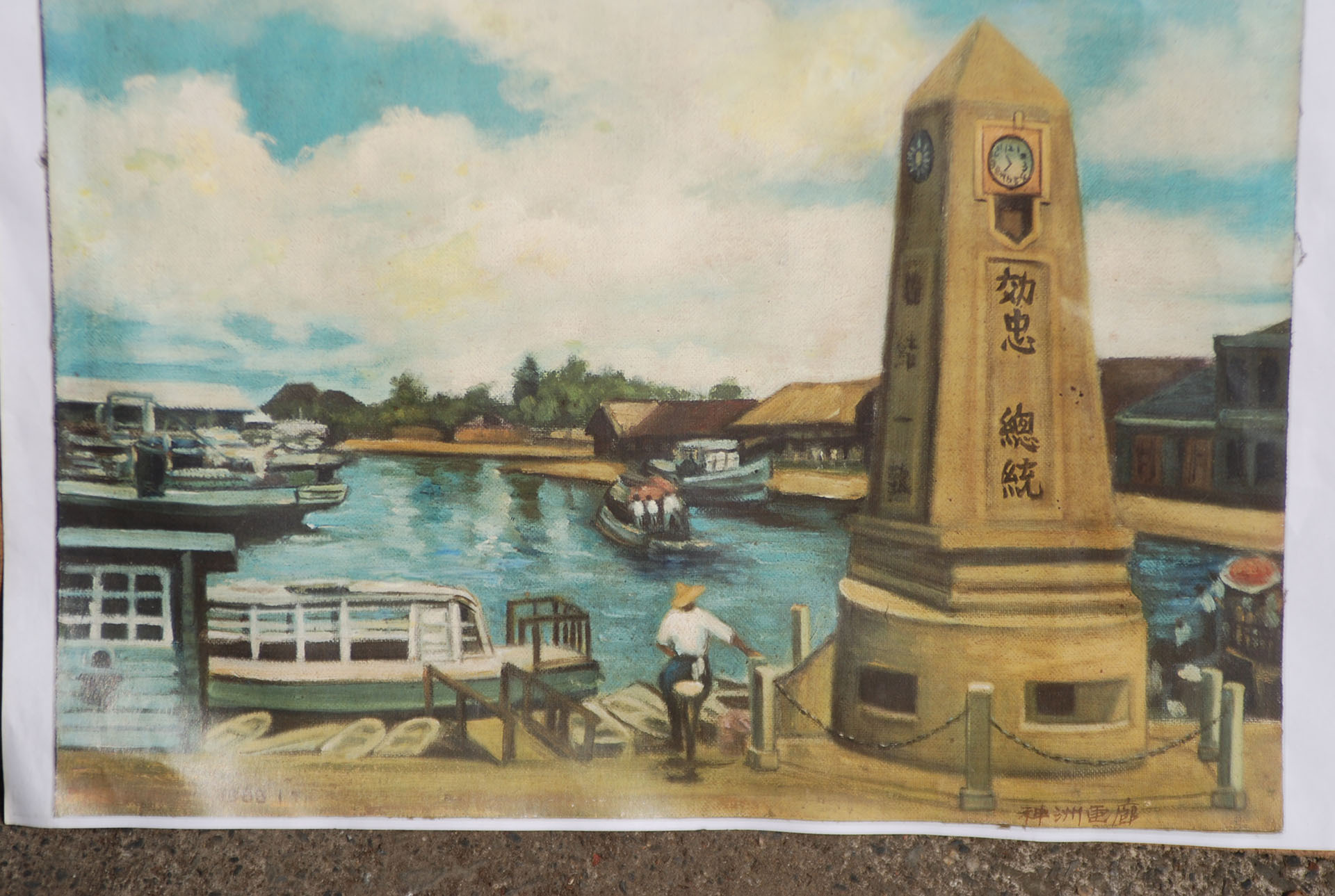 本物件為董日福先生提供之水彩畫作,繪畫位置運河盲段往西面,現住址為臺南市中正路西側河樂廣場入處。畫面中完整看到運河盲段(因類似人體盲腸故得名)的完整模樣。清楚畫出左側往來臺南安平間的碰碰船、戰後建造的政治宣導碑壘,上頭有著標準鐘下方寫著效忠總統的口號,左側面上頭則是黨徽下方文字不易辨識,畫面右方則是販售漁獲及乾貨的商店群,後方的則為新南國小。色彩上以寫實的手法將藍天與水文互相輝映,並有完整的景深勾勒出運河盲段的完整樣貌。