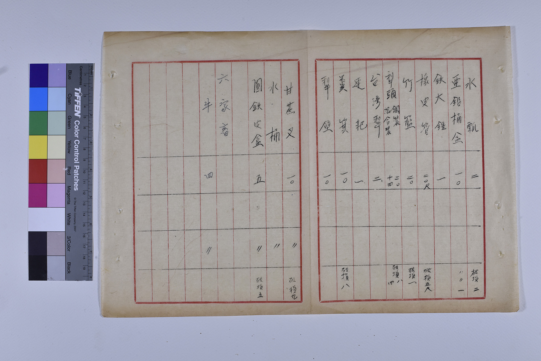 本件為1951年(民國40年)臺糖總爺總廠蔗作改良場農具家畜移交清冊,以十行紙書寫2頁,記錄研究組保管的農具與家畜的名稱、、數量、放置地點。