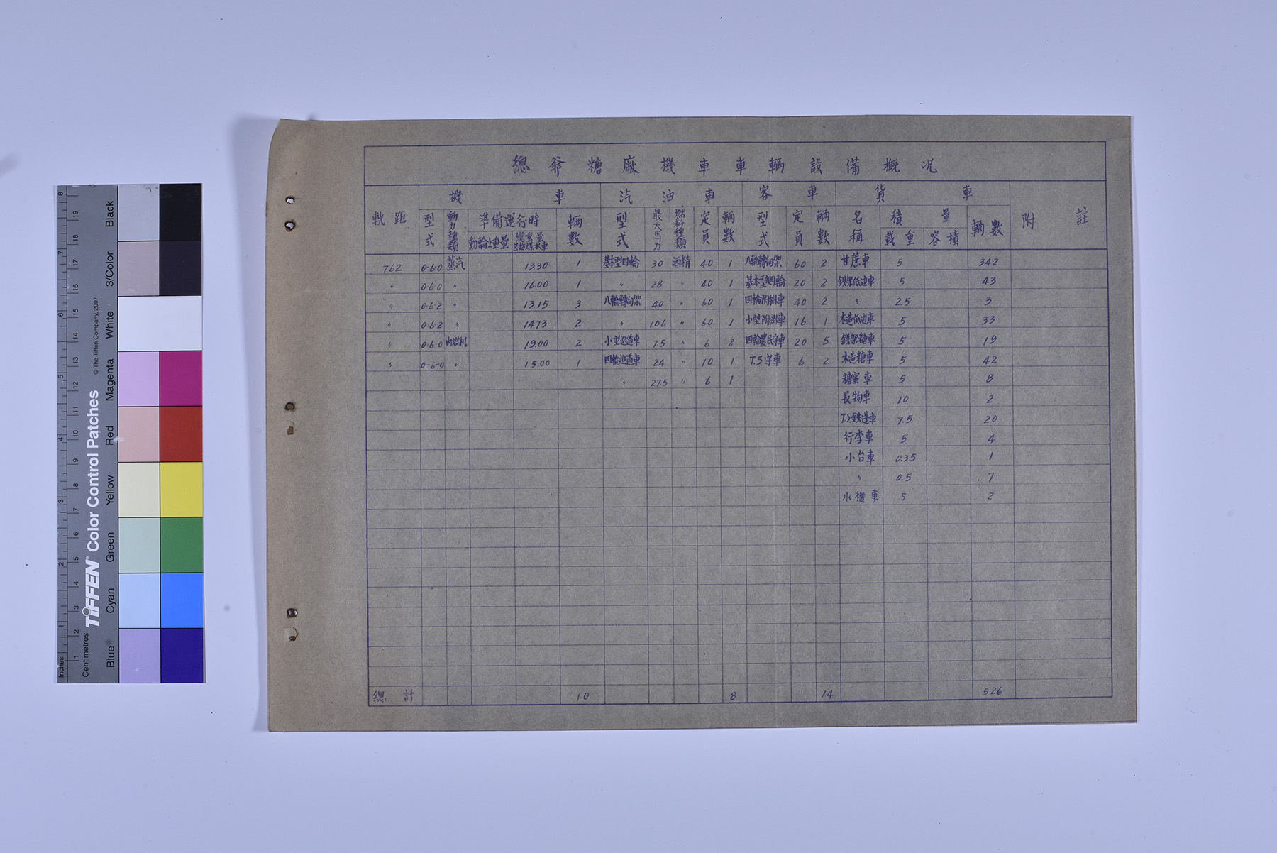 本件為1956年(民國45年)台糖總爺糖廠鐵路機車車輛設備概況,記錄總爺糖廠各式車輛類型有機車、汽油車、客車、貨車等四類,並詳細記載各種車輛的名稱、刑式、數量、載重量等資料。