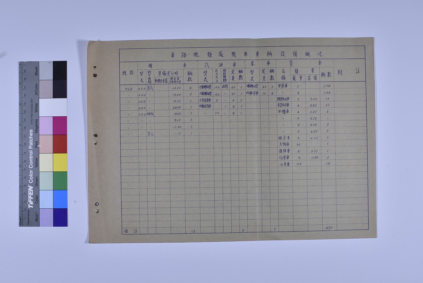 本件為1956年(民國45年)台糖車路墘糖廠鐵路機車車輛設備概況,記錄車路墘糖廠各式車輛類型有機車、汽油車、客車、貨車等四類,並詳細記載各種車輛的名稱、刑式、數量、載重量等資料。