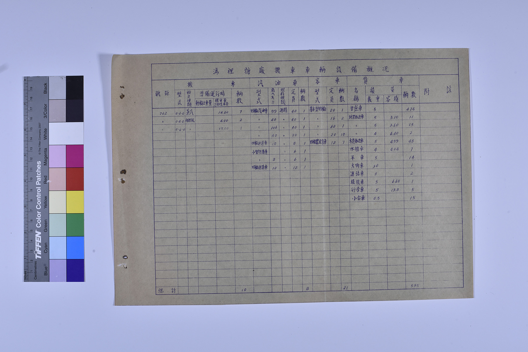 本件為1956年(民國45年)台糖灣裡糖廠鐵路機車車輛設備概況,記錄灣裡糖廠各式車輛類型有機車、汽油車、客車、貨車等四類,並詳細記載各種車輛的名稱、刑式、數量、載重量等資料。