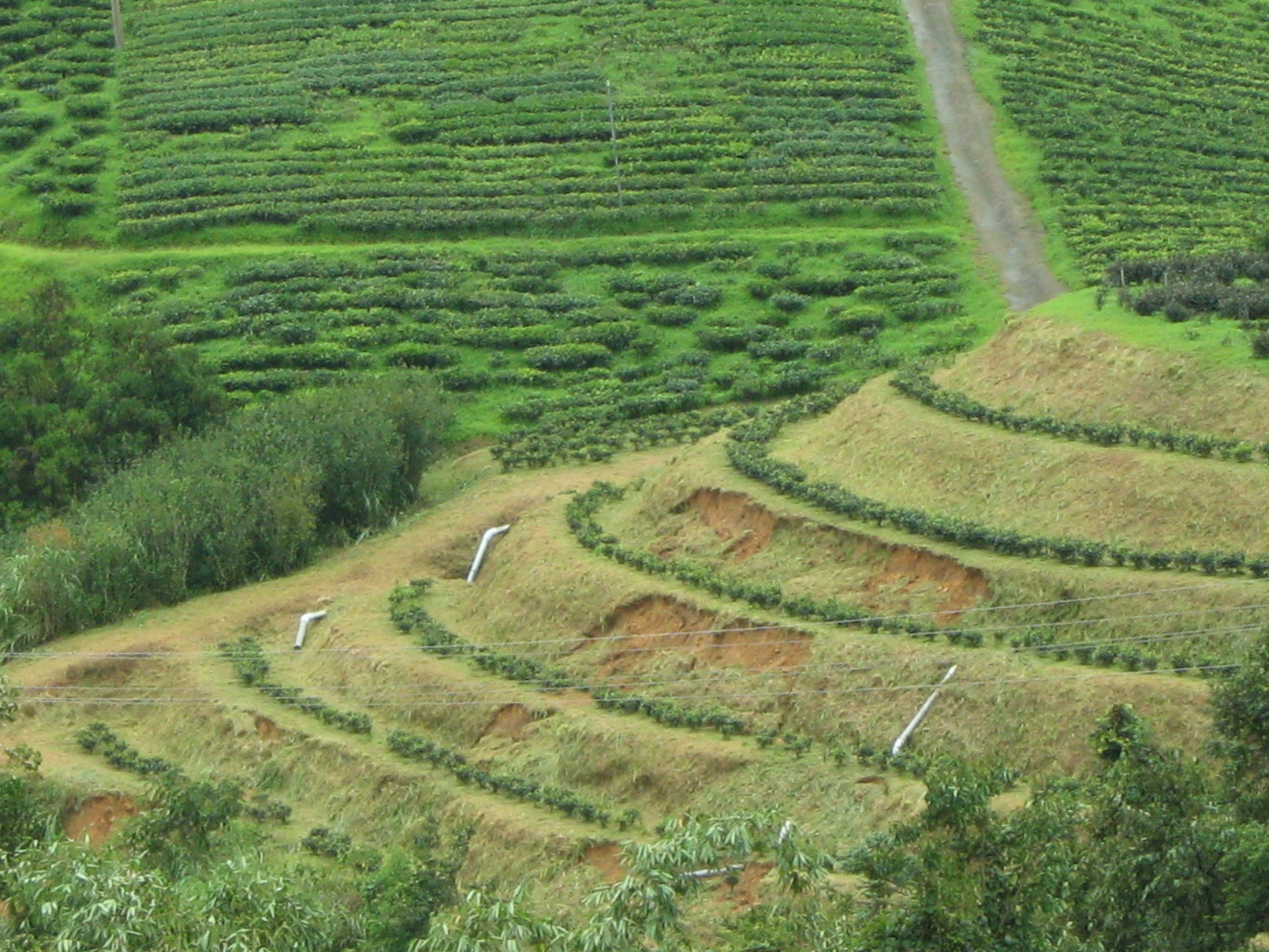 照片主題是「卡玫基風災期間茶業改良場魚池分場茶園平台階段小崩塌」。在2008年(民國97年)卡玫基風災期間,受到連續強降雨的影響,茶園田間土壤幾乎達到飽和含水量,平台階段在逕流來不及宣洩的情況下,水流向外緣切割造成邊坡的小崩塌。