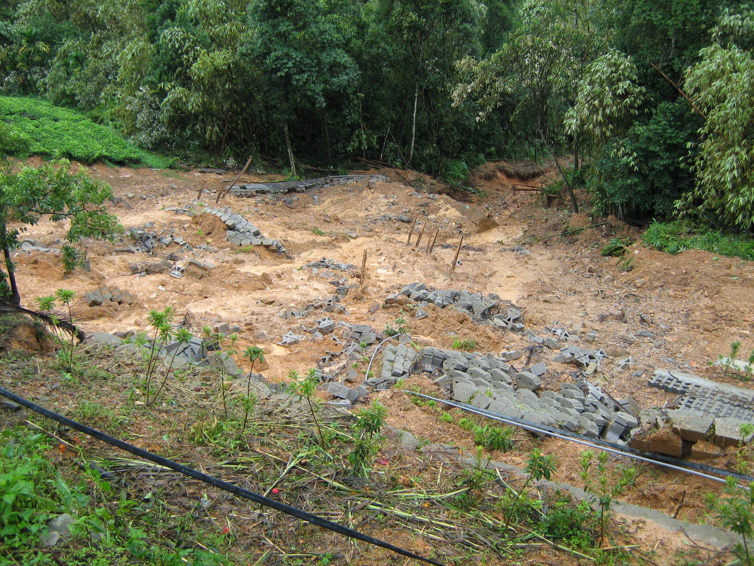 根據交通部中央氣象局日月潭氣象站及茶業改良場魚池分場測候站資料顯示,2008年(民國97年)7月17日24時至18日上午9時,兩處10小時測得雨量分別為496mm及509.5mm,平均最大風速達至6至10級風;其中以17日24時至 18日上午6時風強雨大,平均每小時降雨量超過60mm以上,造成茶業改良場魚池分場預鑄結構擋土牆滑落。茶園邊坡為穩定土石及兼顧生態保育,以預鑄結構擋土牆施作,當逢強降雨的天候下逕流水無法正常排放,造成擋土牆基礎遭到掏空,整座擋土牆亦不敵摧殘而崩塌。
