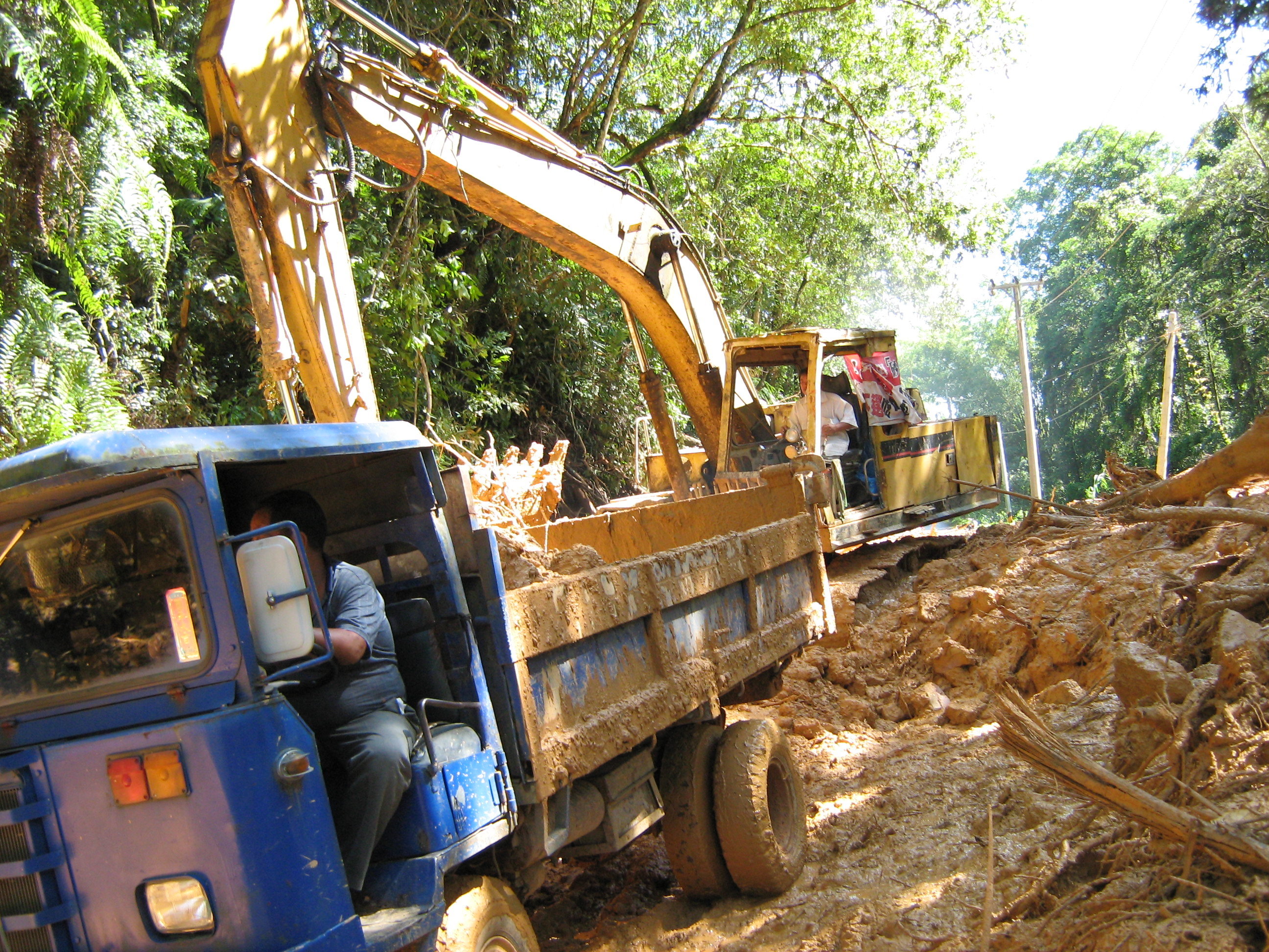 照片主題是「卡玫基風災期間茶業改良場魚池分場茶園農路清淤」。卡玫基風災期間,茶業改良場魚池分場茶園邊坡受到侵蝕而崩塌滑落,造成出入場區通路受阻,因此僱用怪手及搬運車輛進行清淤工作,將路面阻擋雜物、倒伏樹枝幹及泥流等清除,唯有先清除路面障礙物,才能讓分場同仁進入場區,進行風災的善後工作。