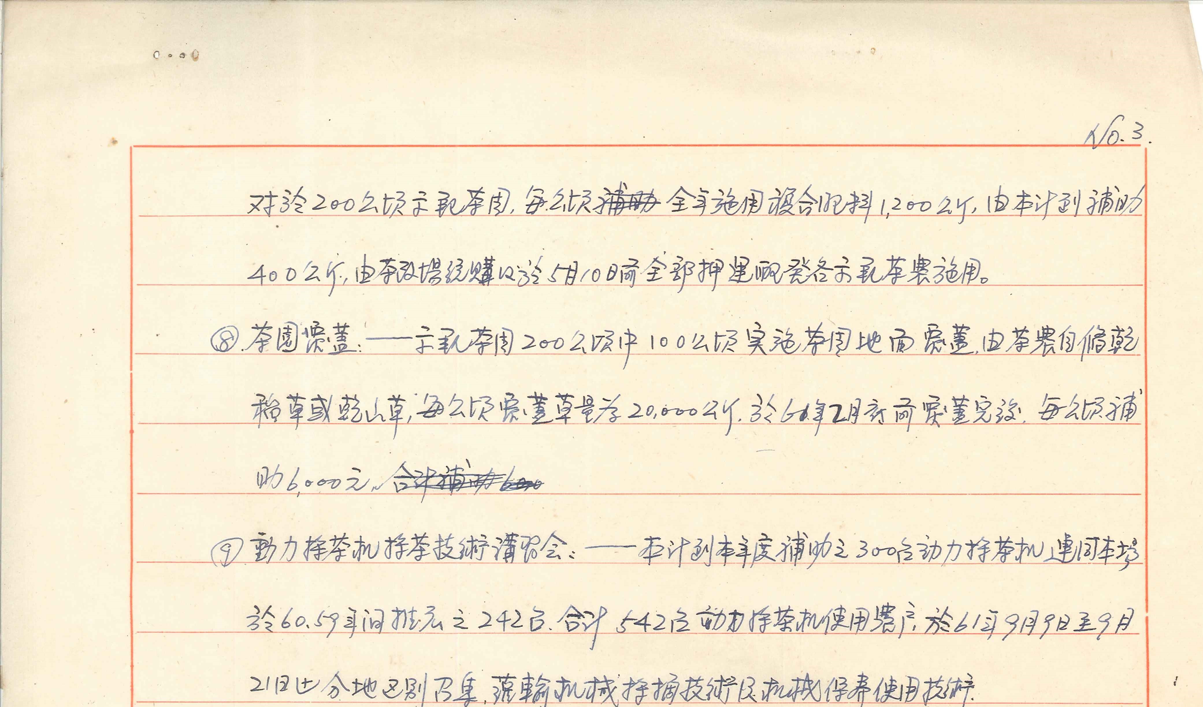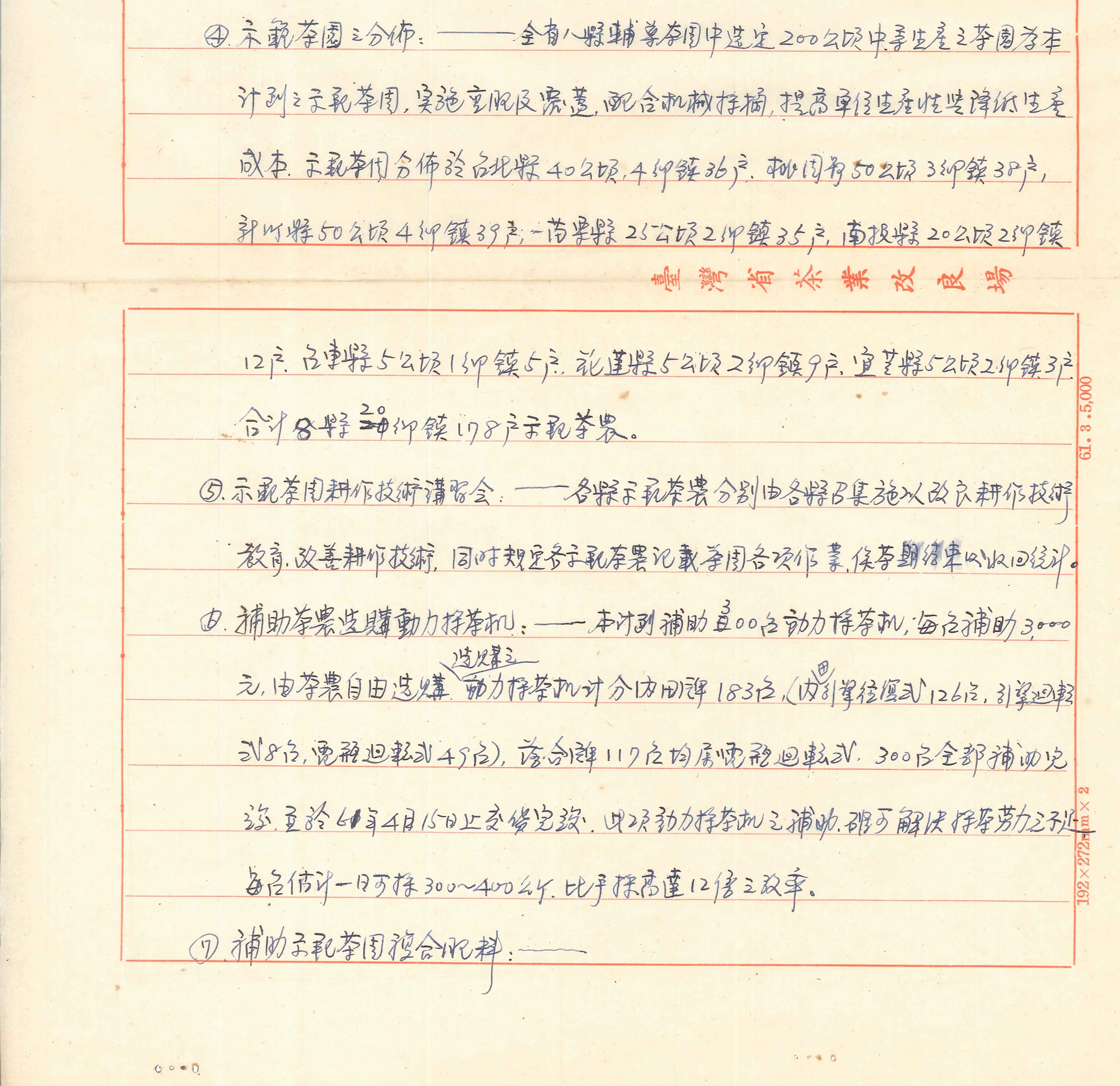 1972年(民國61年)茶葉生產改進計畫-輔導「示範」茶農採用改良耕作法。本計畫由茶業改良場執行,輔導「示範」茶農採用改良耕作法,包含示範茶園選定、示範茶園工作技術講習會、輔導茶農選購動力採茶機、補助示範茶園複合肥料、茶園覆蓋、動力採茶機技術講習會。