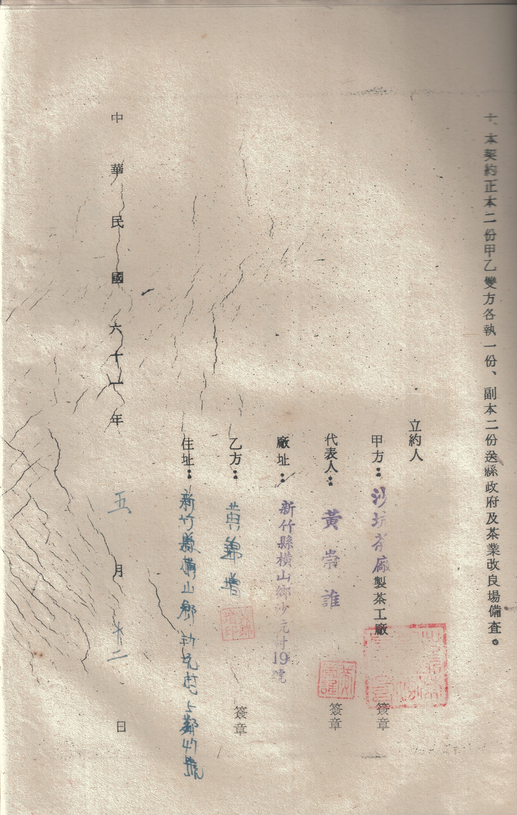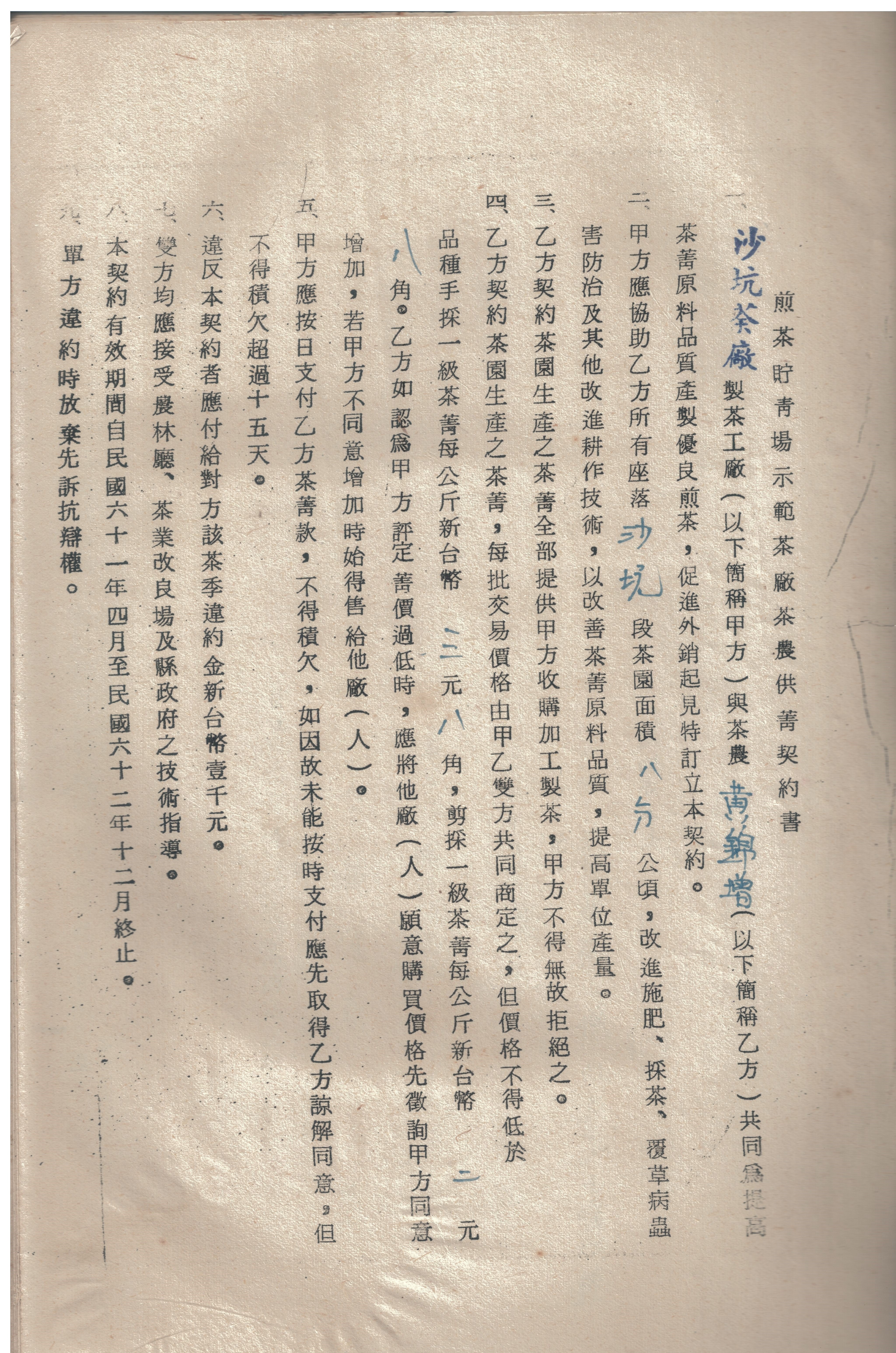 1972年茶葉生產改進計畫-加強貯菁設備改善煎茶品質計畫之合約書內容。新竹縣橫山鄉沙坑茶廠與茶農簽訂茶菁收購價格之「煎茶貯菁示範茶廠茶農供菁契約書」。內容包含茶農需落實施肥、採茶、敷蓋、病蟲害防治及其他進步的耕作技術,改善茶菁品質,提高產量。茶農提供的茶菁全部提供給製茶廠,製茶廠不可無故拒絕。每批茶菁價格由茶農與製茶廠兩方共同訂定,但一級手採茶菁價格不能低於3.8元/公斤,一級的剪採茶菁價格不能低於2.8元/公斤。如果茶農認為製茶廠評定的價格過低,茶農可詢問其他製茶廠願意收購之價格,原製茶廠如果不同意提高價格,茶農則可將茶菁販售其他人。製茶廠應當天支付茶農採收茶菁款項,若未能按時支付需先得到茶農諒解同意,但不能積欠超過15天。違反本契約應付給對方違約金1,000元。 雙方應接受農林廳、茶業改良場及縣市政府之技術指導等細則。
