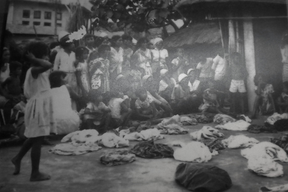 此幀照片推測為黃貴潮先生為部落中正等待領取美軍配給麵粉(袋)的孩童所拍攝之照片。教會事業在原住民部落的成長,並作為傳教方式的新模式,影響天主教會在戰後的新形象,然而,另外一種不可忽視的、深具戰後特色的教會工作—美援物資的發放,同樣地也深深的影響了那個世代的臺灣人對於天主教會的觀感和看法。天主教白冷外方傳教會的紀守常神父,他們在進入一個新地區準備傳教之初,都不約而同運用美援物資來跟當地居民「交朋友」,而且他們都很聰明地在一開始就以全部落或全村作為發放對象,而不以是天主教徒或是基督新教徒而有所分別,這樣的作法成功地吸引了許多外教徒甚至原本的基督新教徒加入天主教會。