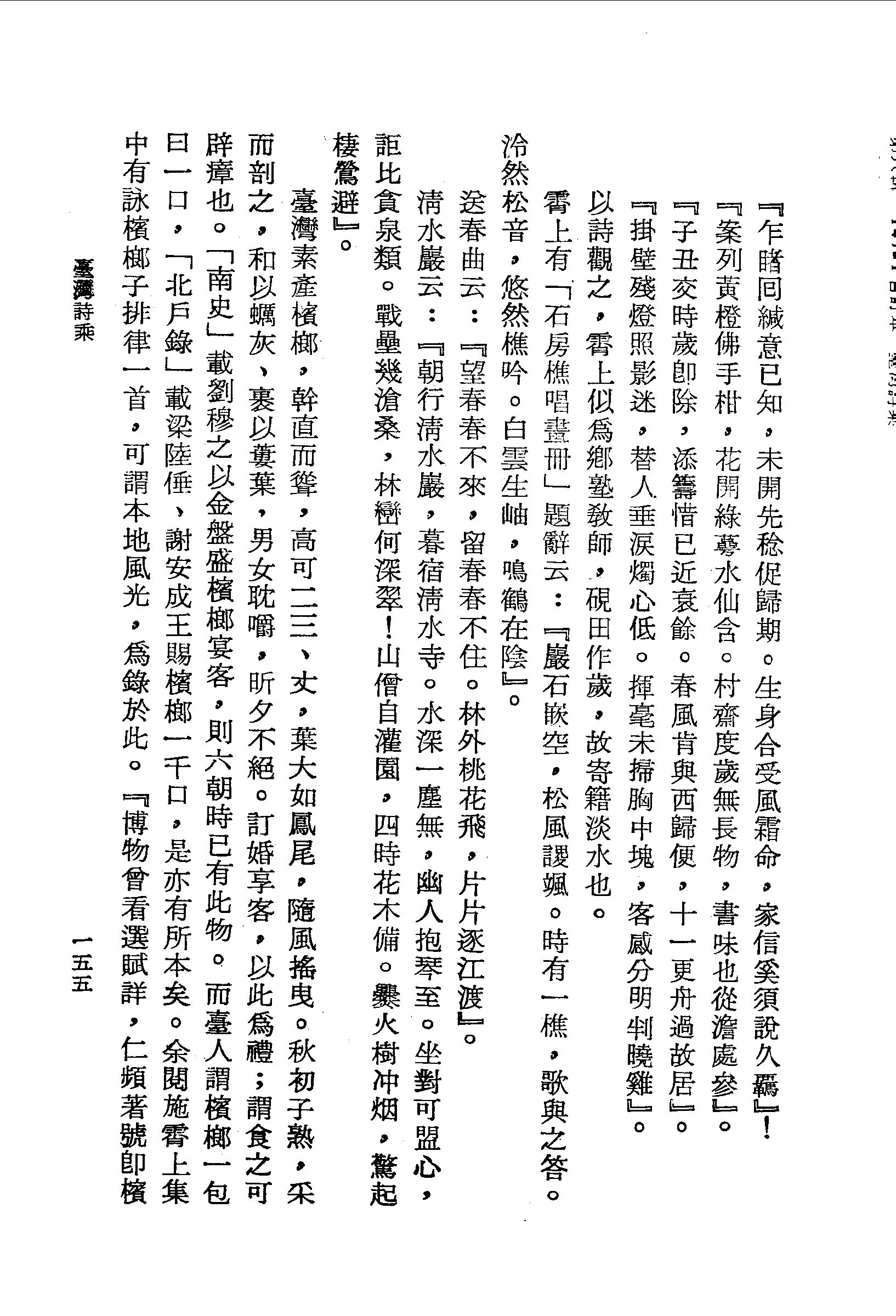 此條檳榔的史料,出自《臺灣詩乘》。《臺灣詩乘》的作者為連橫,按時間序收錄200多位臺灣詩人的1000多首詩作。由於該詩集編纂宗旨為「詩則史,史則詩」,因此被視為《臺灣通史》的附屬作品。連橫希望藉由這些不同時期的文學詩作,呈現臺灣各個時代不同的歷史樣貌。