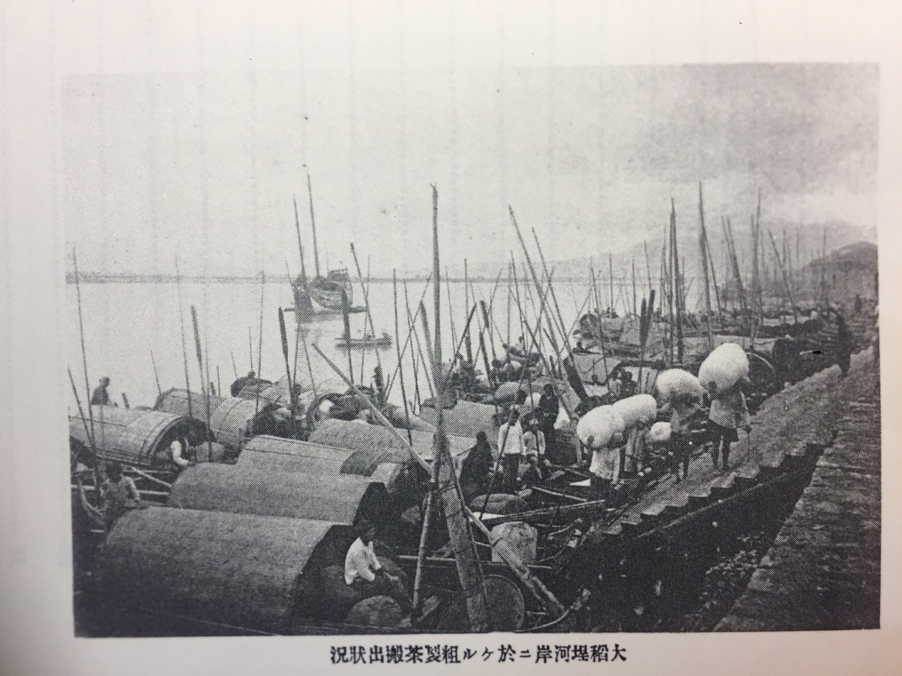照片刊載於西元1916(日大政5)年《台灣茶ニ關スル調查(台灣茶相關的調查)》中,大稻埕碼頭上由船上搬運茶葉下岸。照片中,碼頭上停泊的船隻是屬於通行於淡水河系的小型河船,俗稱「紅頭船」,此種河船在淡水河最大支流大漢溪(原稱大嵙崁溪),可上溯至龍潭三叉渡口。