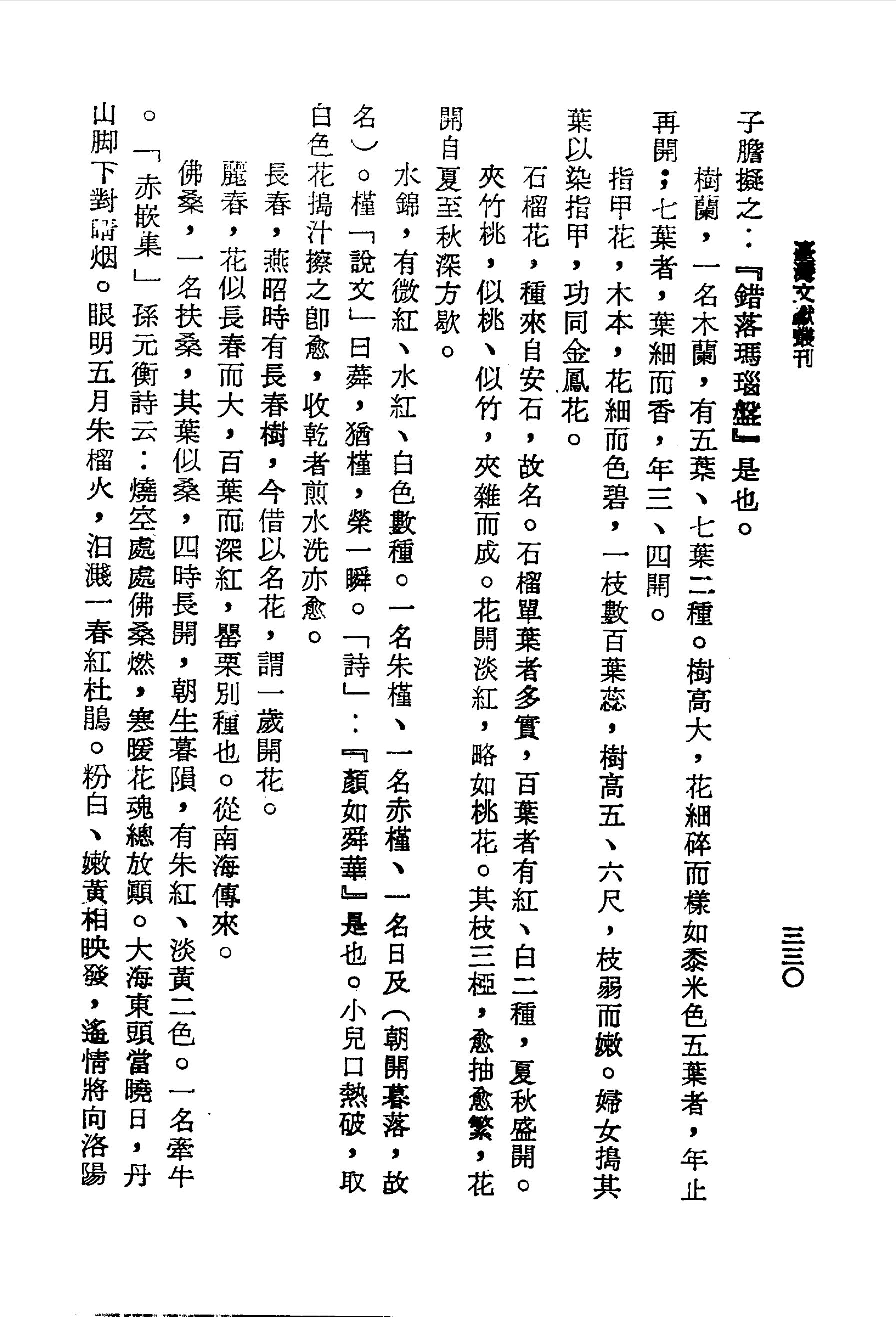 水錦,有微紅、水紅、白色數種。一名朱槿、一名赤槿、一名日及(朝開暮落,故名)。槿「說文」曰蕣,猶槿,榮一瞬。「詩」:『顏如舜華』是也。小兒口熱破,取白色花搗汁擦之即愈,收乾者煎水洗亦愈。