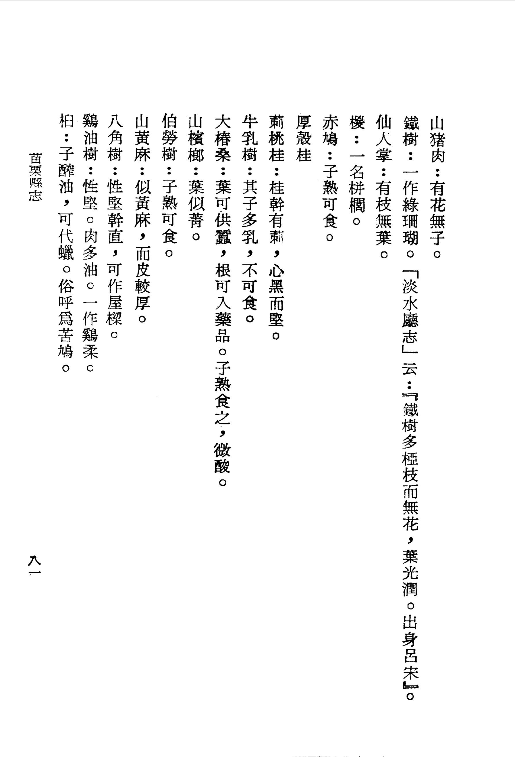 這則介紹大椿桑的史料出自於《苗栗縣志》,《苗栗縣志》是苗栗地方設縣後的第一本方志,其纂輯者為沈茂蔭。沈茂蔭是浙江省蕭山縣人,於清光緒17年任苗栗知縣,光緒20年啟動修纂《苗栗縣志》的工作。由於沈茂蔭並非當地人,到任3年多也不可能真正熟悉苗栗地方的風俗、物產、土地形勢等情況,所以他按歷代編修地方志的傳統,聘請苗栗縣當地舉人謝錫光、謝維岳舉人、生員黃文哲、李鍾萼、郭鏡清、恩貢生杜式珪、附貢生曾肇楨、廩生黃肇儒等8人擔任「采訪」(類似今日的田野調查與史料搜採徵集工作)。因此,本志最大的特色是較多客家族群的仕紳觀點,對研究苗栗堡年代的客家文化是不可或缺的參考材料。