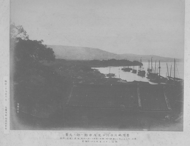 照片日文說明大意為「岸邊排列的住家是台灣人所居住,上方部分則是外國人住家。左邊停泊著船的是淡水河口,中央一帶有著畦的耕地是水田。」照片中的船隻,近前端的是中國傳統的三梶近洋海船「䑸」,又稱唐山帆船、中國式帆船、老閘船或戎克船;較遠端的有一部分是單梶與雙梶的河船。由照片中船隻形式、拍攝的位置,推測是當時與中國大陸進行貿易的碼頭。由於照片歷史已久,日文文字描述之情景,很難清楚呈現。《臺灣諸景寫真帖》發行於1896(明治28)年,為日本佔領臺灣初期,日本陸軍參謀本部陸地測量部人員,至各地拍攝的景點照片,編輯並發行共兩輯。第一輯為北部地區之照片,第二輯為南部地區之照片,目前存於日本國會圖書館,所建之數位檔網址為https://dl.ndl.go.jp/info:ndljp/pid/773768。