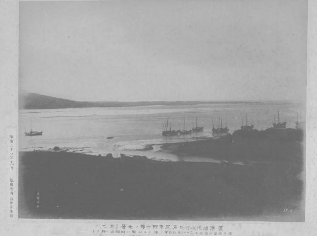 照片日文說明大意為「寬廣的水面是淡水河,由左方流向右方。側面的山脈是獅頭山山腳。」照片中由右向左流入淡水河的支流,可能是目前捷運淡水站靠臺北市端的小河。河岸邊停靠有一排中式近海航行的帆船,河的最右側幾可看到淡水河出海口。日文說明的獅頭山是指現今的觀音山。《臺灣諸景寫真帖》發行於1896(明治28)年,為日本佔領臺灣初期,日本陸軍參謀本部陸地測量部人員,至各地拍攝的景點照片,編輯並發行共兩輯。第一輯為北部地區之照片,第二輯為南部地區之照片,目前存於日本國會圖書館,所建之數位檔網址為https://dl.ndl.go.jp/info:ndljp/pid/773768。