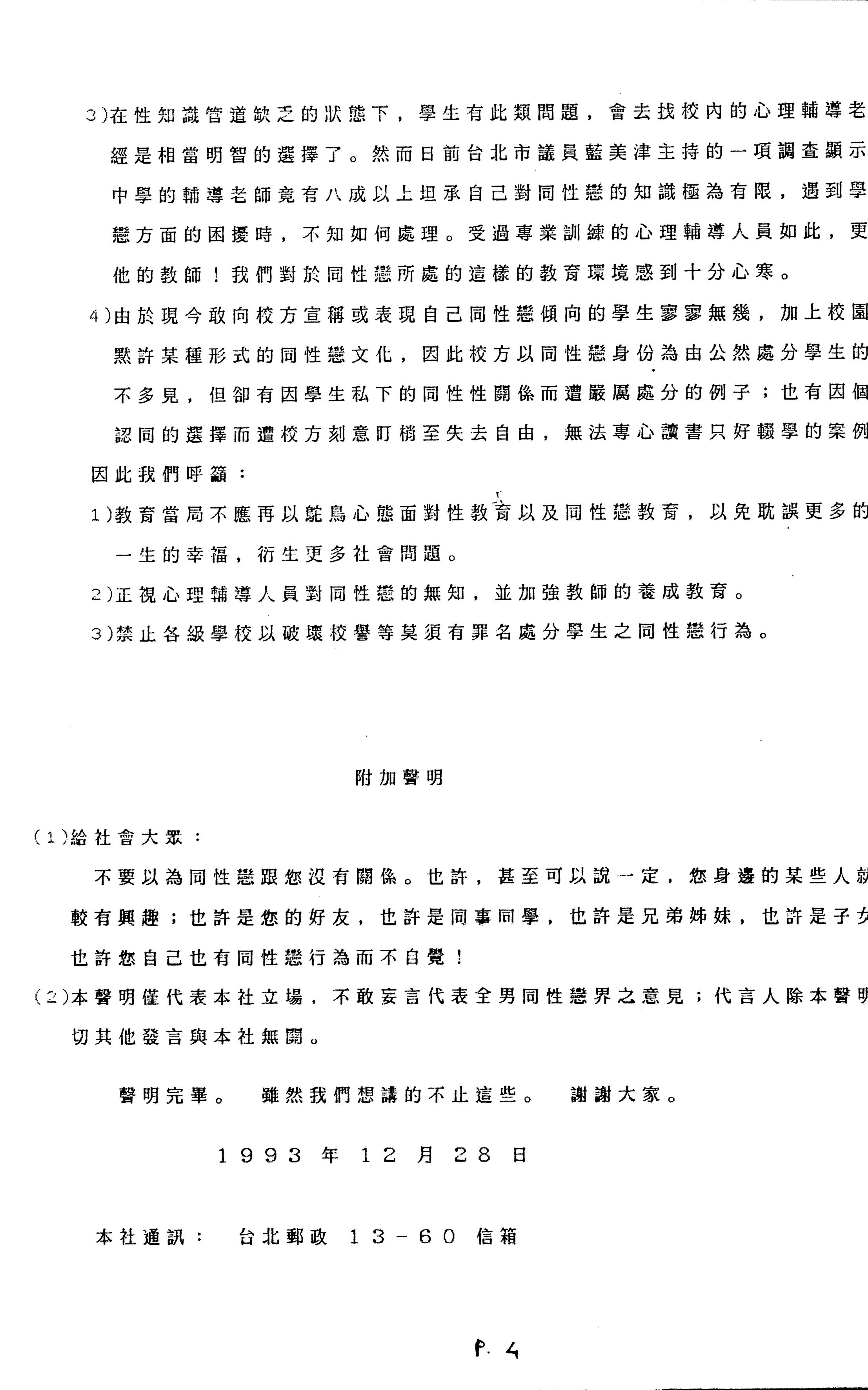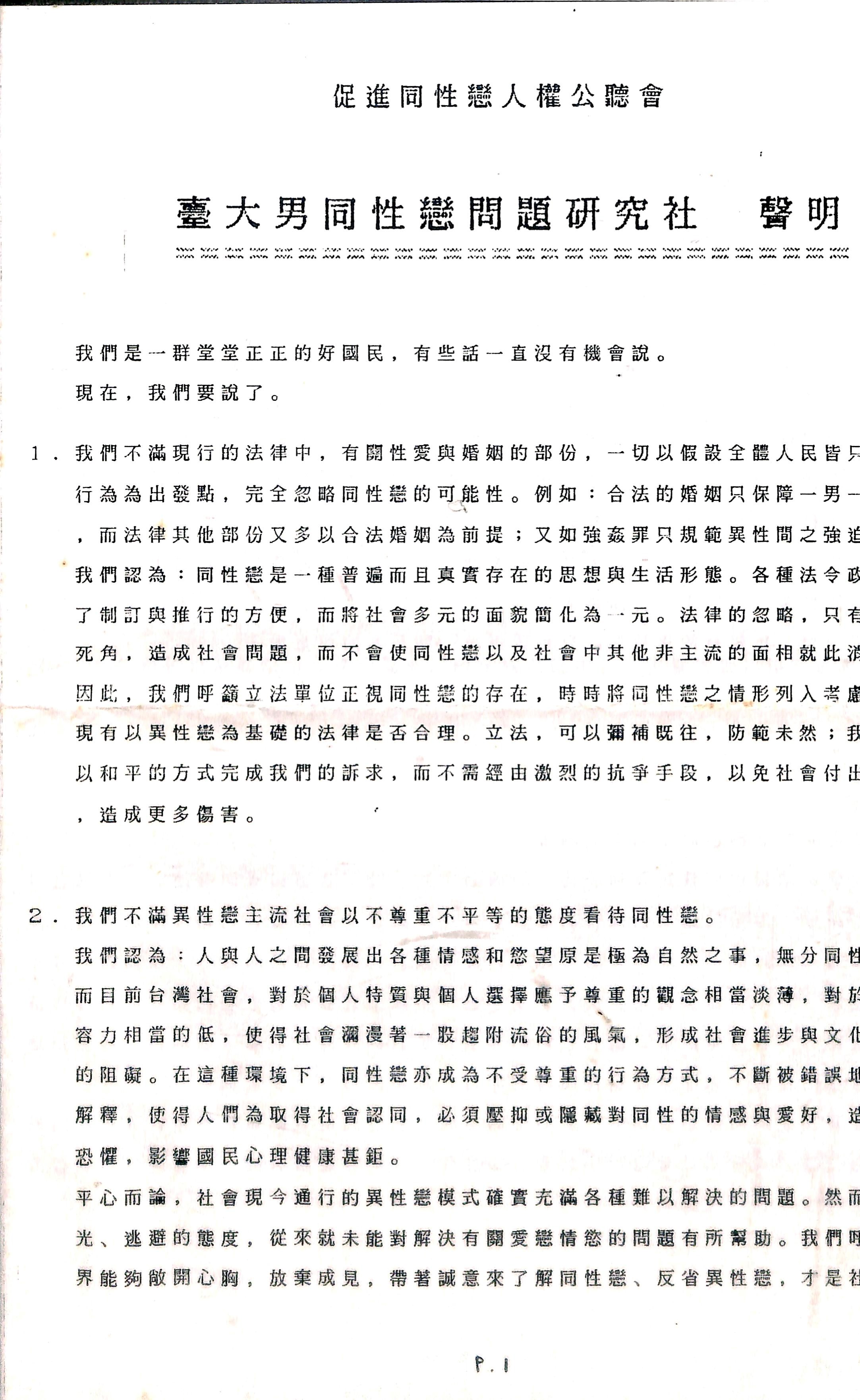 會中六個團體由發言人韓家瑜發表反歧視及爭取同性戀人權的聯合聲明,強調「《反歧視法》應是落實保障弱勢者權益的社會立法,但是同志身為弱勢族群之一,卻未被列入保障對象。因此為全面貫徹憲法第7條之平等原則,我們要求列入保障同志權益之條款,並儘速讓同志免於受警察取締侵害;工作權及受教權不應被剝奪;衛生署應檢討充滿歧視的愛滋防治政策等。」(整理自倪家珍,1997。其引用自同志工作坊,1994)
