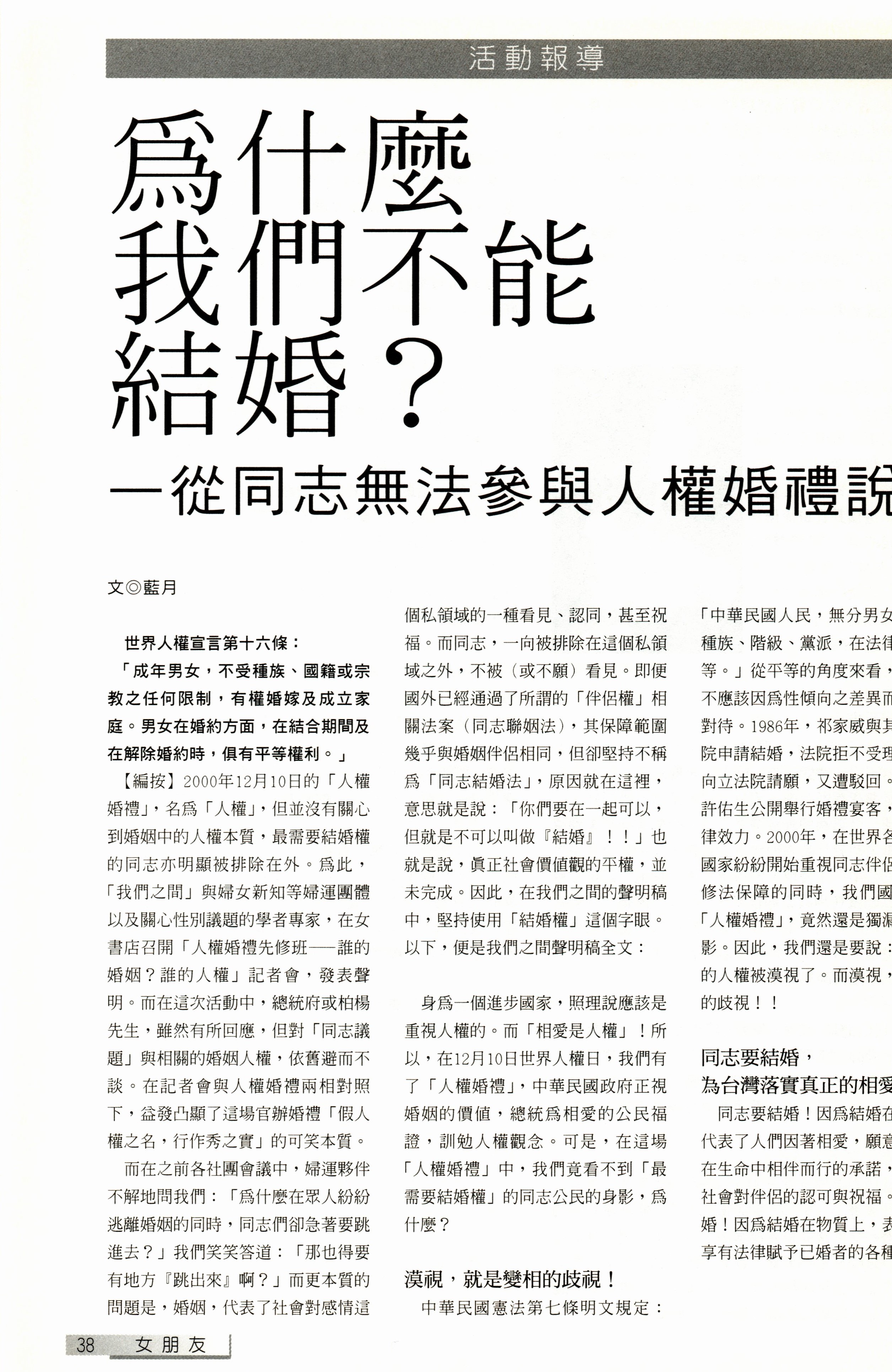此文章登於2001年7月10日出刊、第三十四期《女朋友》雜誌雙月刊,撰文者為藍月。此文是「我們之間」的聲明稿,抗議2000年12月10日,在作家柏楊的建議下,於世界人權日當天,由總統府與中華文化復興運動總會主辦、人權教育基金會協辦,在台北賓館舉行的「人權婚禮」。由時任總統的陳水扁擔任證婚人,主婚人為監察院長錢復、內政部長張博雅,介紹人則是柏楊以及總統府資政余陳月瑛,陳水扁稱此婚禮為「跨世紀大喜之日」。