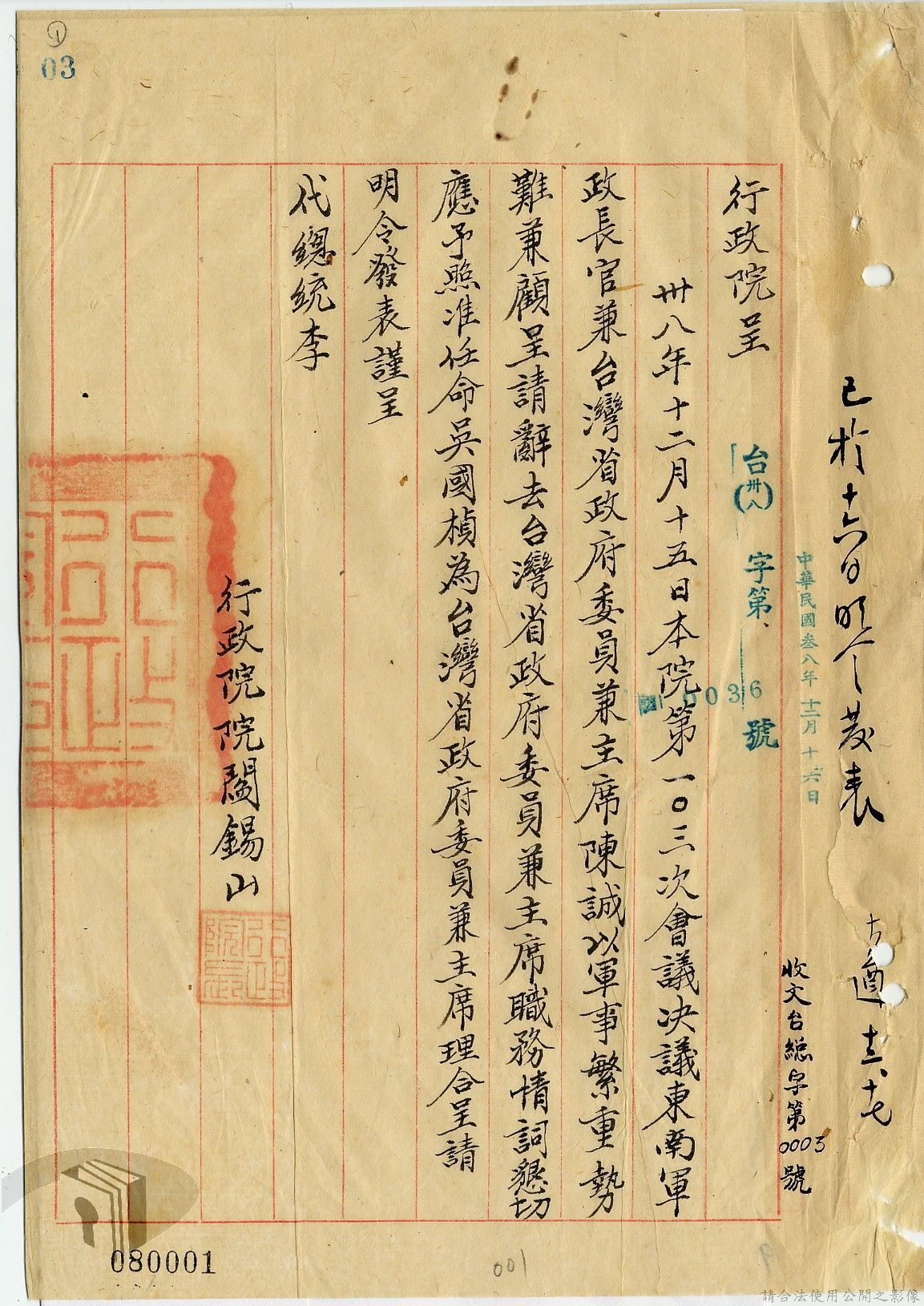 本案為38年間,行政院院長陳報總統有關行政院在該年12月15日舉行的第103次會議中人員請辭任用案決議結果,內容為陳誠請辭臺灣省政府主席獲准以及任命吳國楨繼任臺灣省政府主席,並請總統明令發表,總統府將人事命令予以公布。