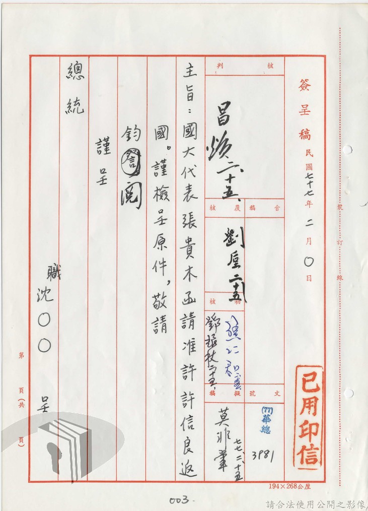 本案為77年間,國民大會代表陳請總統以政治家的魄力,准許讓前桃園縣長入境接受政府審判,解除司法的窘境,共同開創更祥和、更民主、更進步的政治環境,以樹立政府新的形象,總統府秘書長後將國大代表信函呈送總統參考。