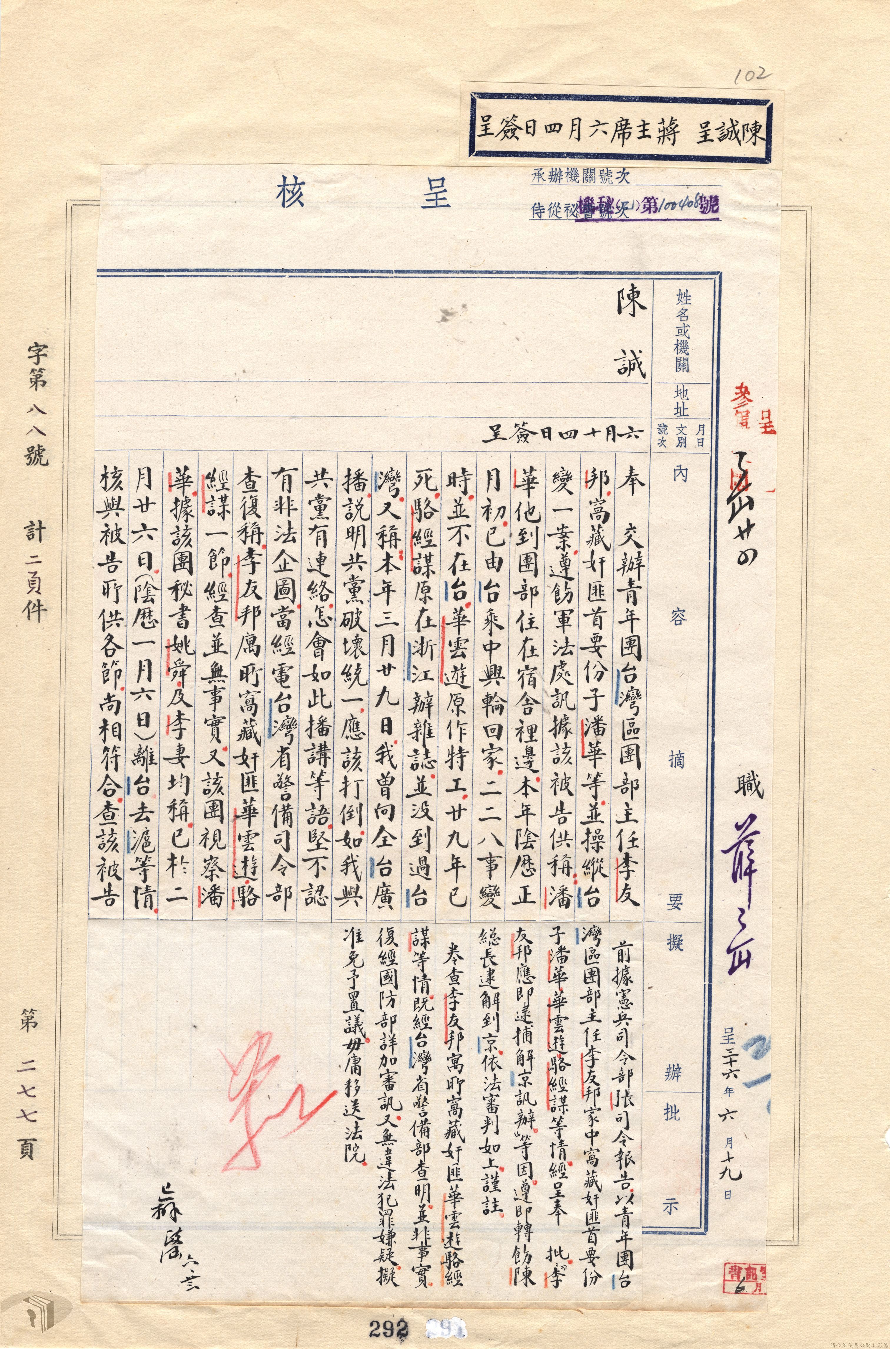 本案為36至37年間,有關二二八事件期間面呈國民政府主席蔣中正之各項相關情資報告及其決策指示;包括陳儀對事件發生期間之處理情形及請求派兵增員之電文,廿一師及要塞司令部呈報進兵平亂經過及蔣主席對兵力部署之指示;桂永清、陳誠、白崇禧、楊亮功及丘念台等人對善後處置意見、人員獎懲建議及事變調查檢討報告等,以及中統局、保密局提供之美、日人士介入事變情形、共黨及臺獨份子煽惑發動暴亂以及反動人士言行;對臺灣省行政長官公署改制為省政府之組織、人事調整之各方意見及蔣主席指示;本案併附蔣主席對臺灣同胞發表之廣播詞、國防部最高委員會對臺事變之決議、警備總部對軍法審訊結果及暴亂案件審核意見表、蔣渭川投案之經過報告、法院判決書等文件。