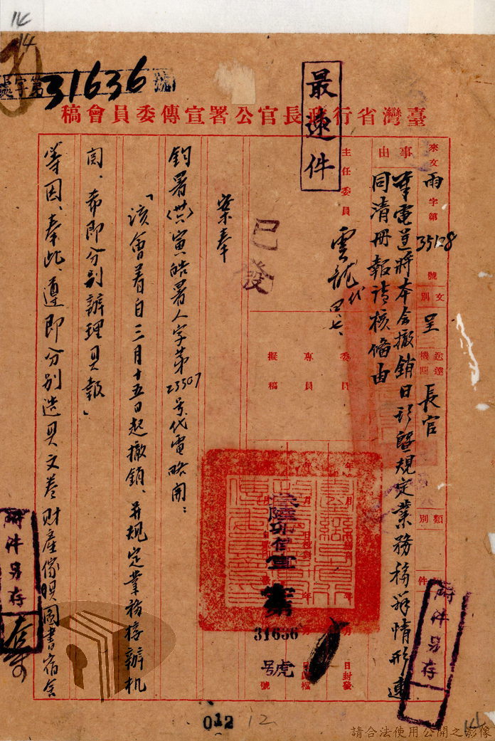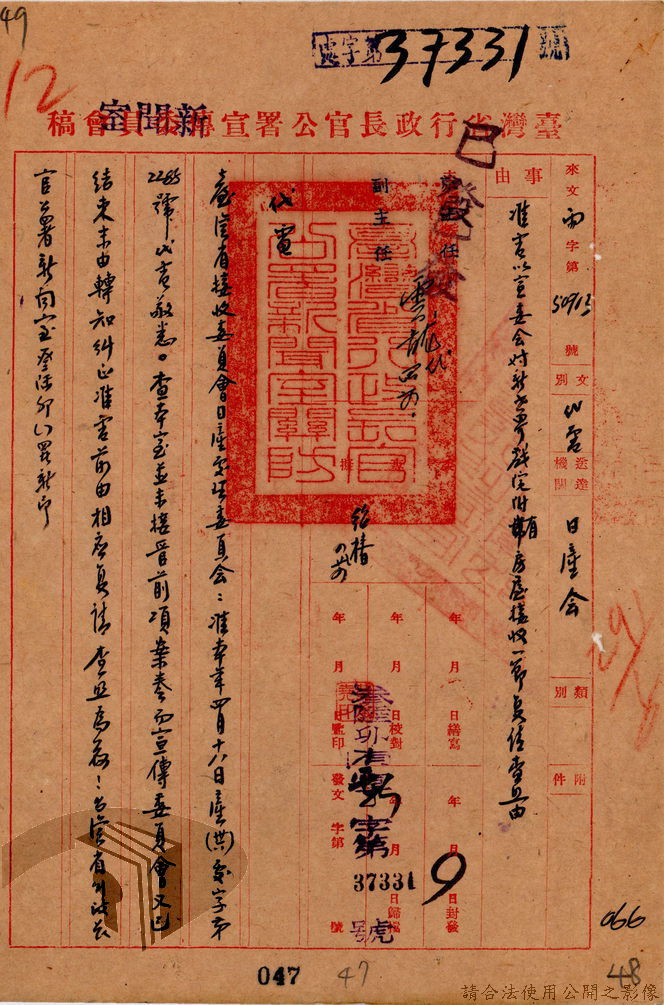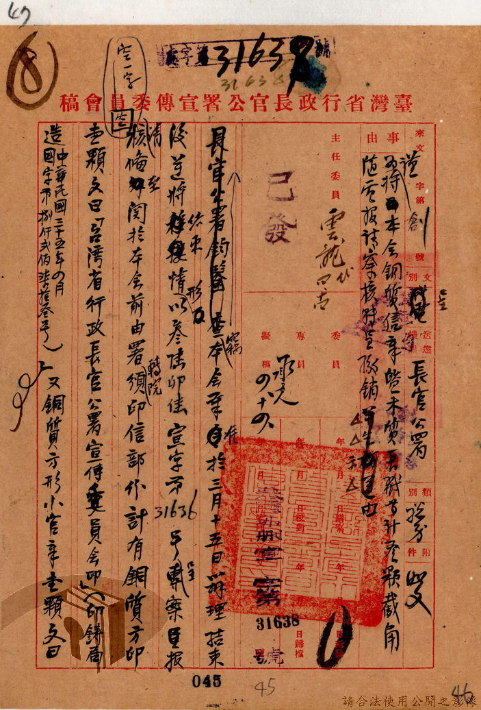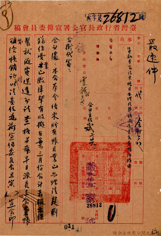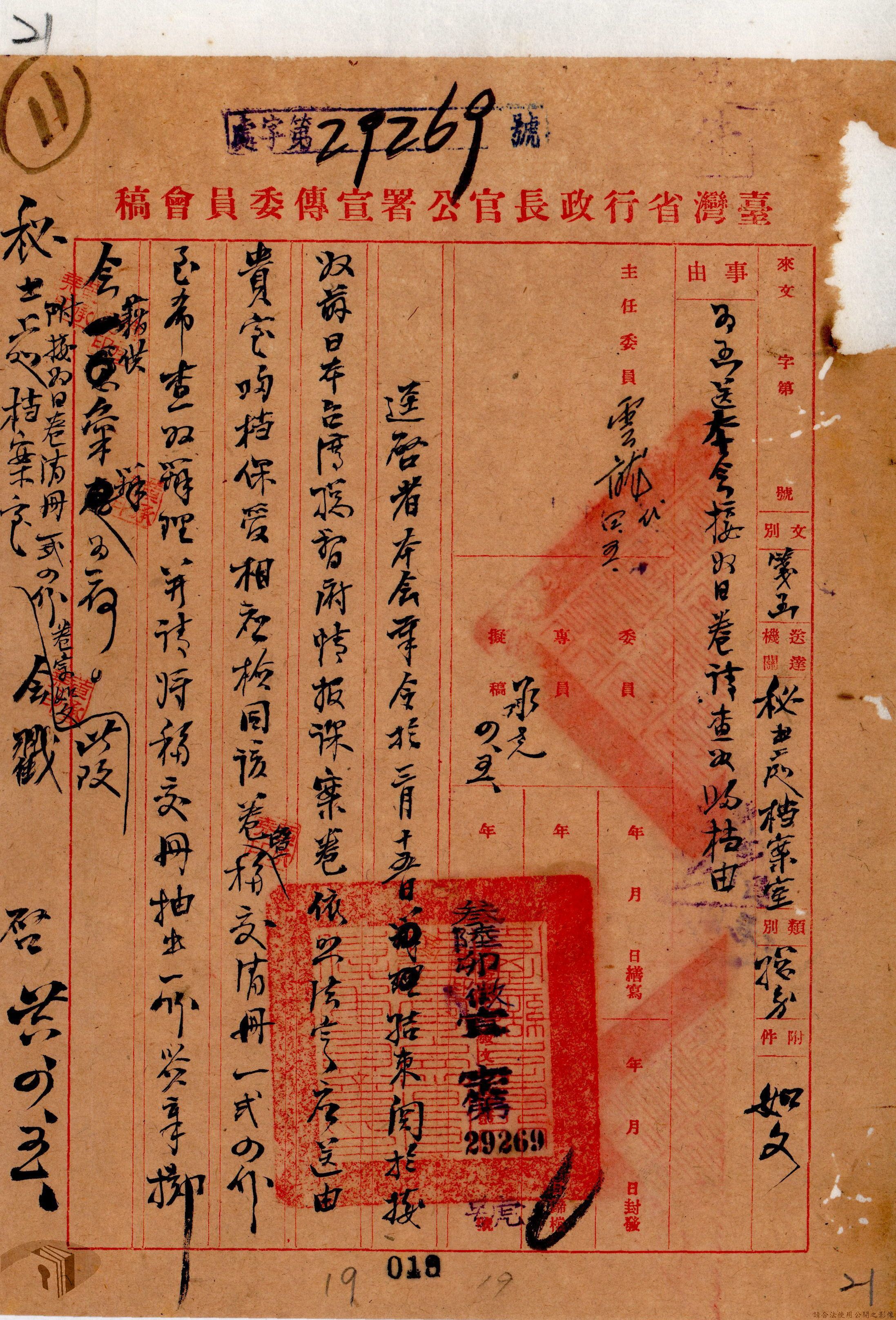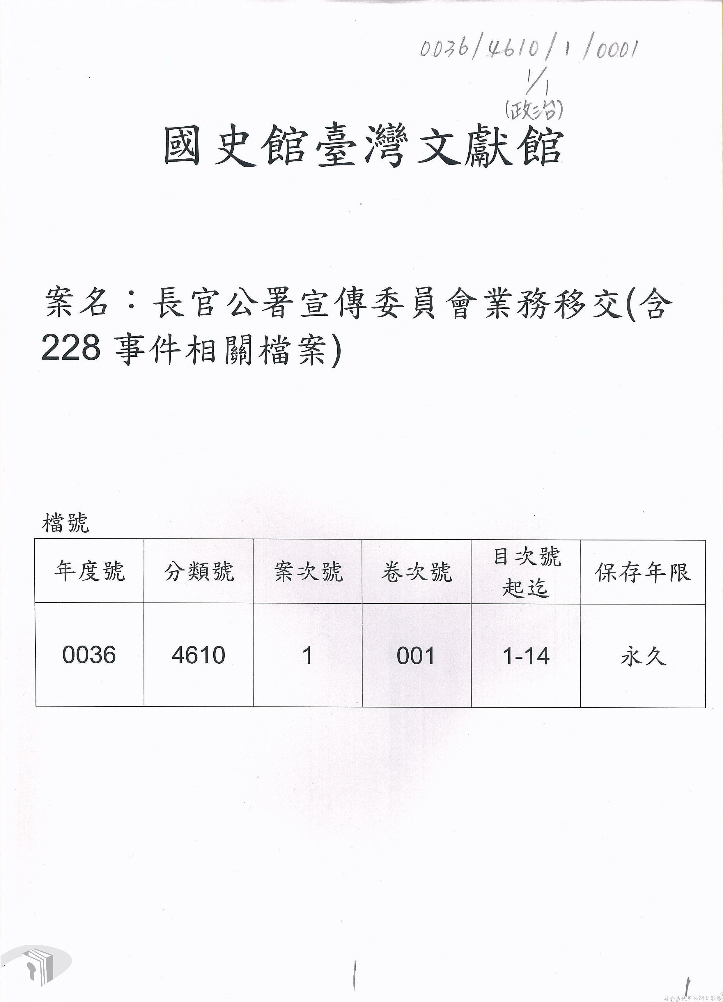 本案為36年間,臺灣省行政長官公署宣傳委員會因即將撤銷,函請該署教育處、新聞室、國際戲院等單位前來接收該會電影戲劇、圖書出版、政令宣導等項目的部門、業務與財產,該會亦函送日本統治時期檔案與會計帳冊單據表報予該署秘書室,且臺灣省接收委員會日產處理委員會為該會房屋移交一事,函請該署核示,後獲該署新聞室回覆;該署令知宣傳委員會向二二八事件賠償委員會領回代墊的賠償費,該會回復已領回入庫,並檢附單據送歸回證單。